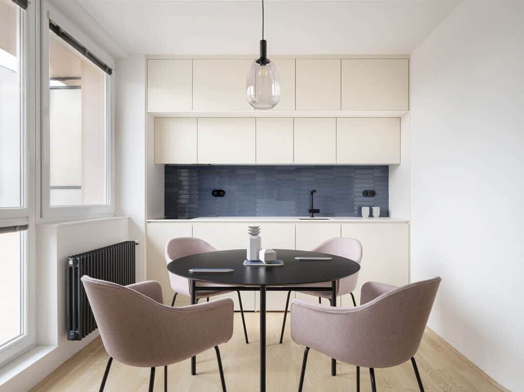 Z klasického třípokojového bytu architekti vytvořili plynulý čistý prostor bez zbytečností. Kombinaci jemných barev a elementárních tvarů dodaly energii výrazné barevné solitéry a plochy.