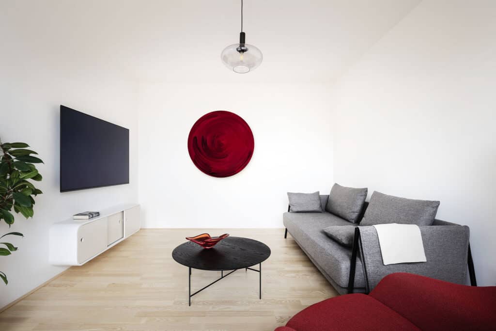 V obývacím pokoji na přání investora navrhli dva menší uzavřené kusy nábytku. Výrazným prvkem je červené ikonické křeslo od finsko-amerického architekta Eera Saarinena. Ložnice je řešena bez úložných prostor, bude sloužit čistě jen na spaní. Výhodou původní dispozice byl sklad, v němž byla instalována nová, na míru vyrobená vestavěná uzavíratelná skříň. Původní umakartové jádro bylo nahrazeno novou konstrukcí, všechny povrchy prošly očištěním a nové omítky se nanášely několikrát pro dokonalé dorovnání povrchů.