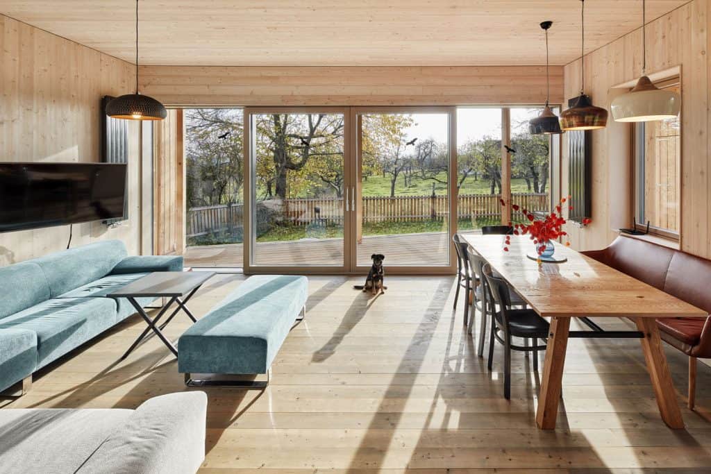 Společný obývací prostor s kuchyní a krbem je orientovaný na opačnou stranu, na krytou terasu. Jižní prosklená stěna poskytuje propojení se zadní částí zahrady a výhled na starý ovocný sad za domem a dále do krajiny. Život rodiny se tu odehrává ve větším soukromí a touto orientací vnesli architekti do domu také více slunce. Společný obývací prostor je otevřen nahoru do podkroví, kam se vstupuje po otevřeném schodišti. Nacházejí se zde dva dětské pokoje, ložnice rodičů, koupelna a sauna.
