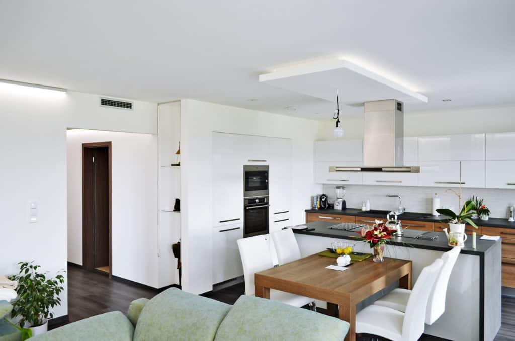 Vytápění v pasivním domě s vysokým podílem prosklených ploch vyžaduje dobře vyladěný topný systém. Pan Závodný k tomu ve svém domě kromě krbu využívá tepelné čerpadlo a rekuperační jednotku. Středobodem domu v Kozlovicích je krb, jehož poloha výrazně ovlivnila vnitřní uspořádání všech místností. „Chtěli jsme mít krb uprostřed hlavní obytné...