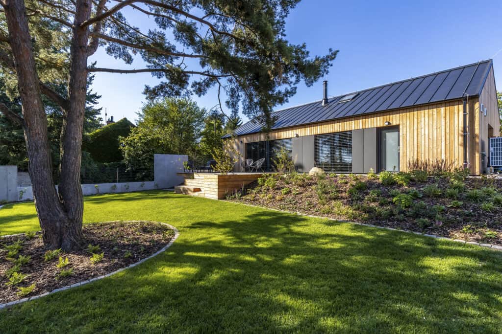 Těšili se, že nový dům bude rodině poskytovat co nejvíce pohodlí a minimum starostí. A to se jim také vyplnilo. Stavba je situována v horní části pozemku u příjezdové komunikace a orientována rovnoběžně s ulicí. Obytné místnosti mají okna do zahrady, prostory zázemí na opačnou stranu směrem do ulice. Obdélníkový tvar se sedlovou střechou se dobře hodí do zdejšího prostředí na rozhraní města a vesnice. Design „dřevěné“ architektury je moderní: kompaktní stavba s velkými prosklenými plochami a minimálními střešními přesahy, hladká střecha z falcovaného titanzinkového plechu.