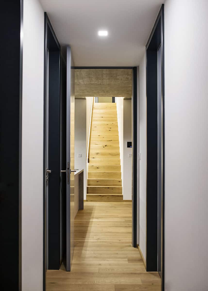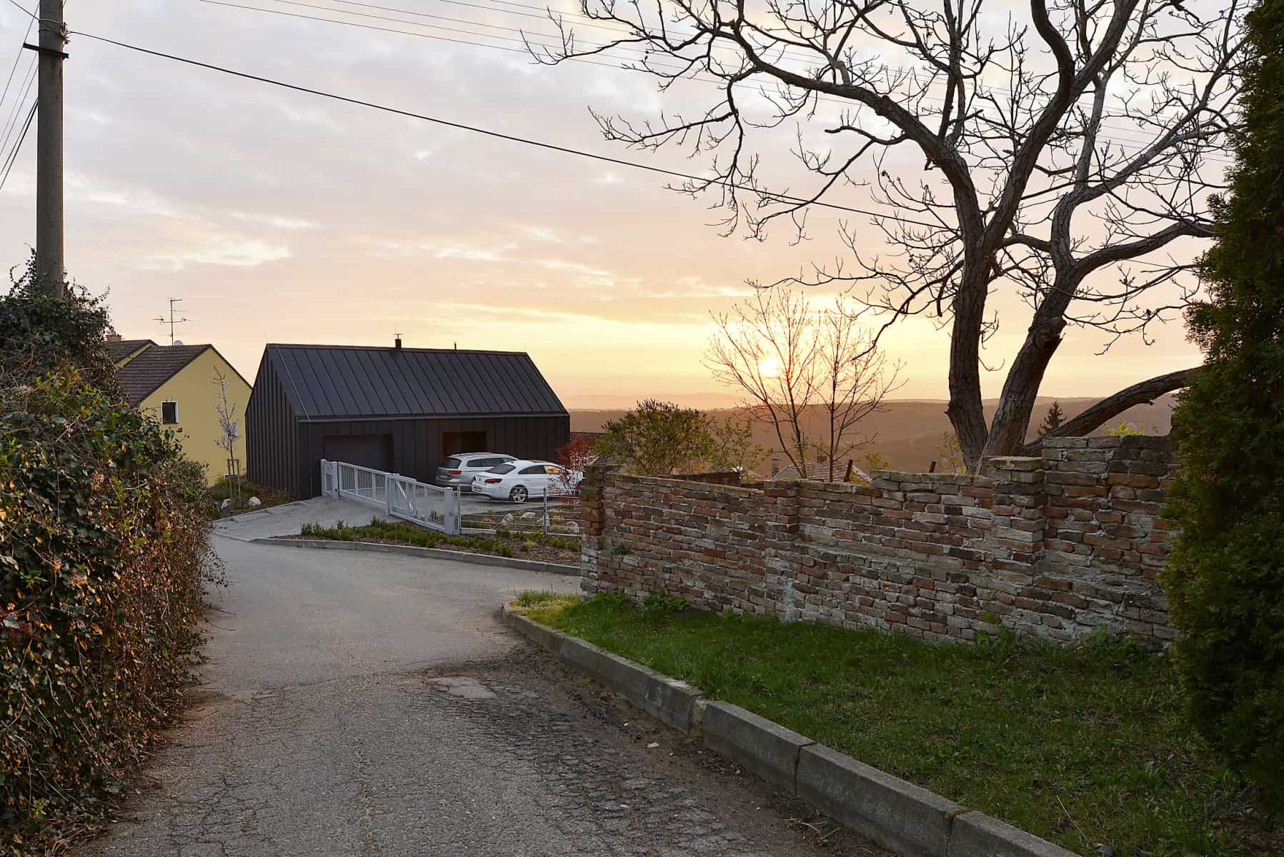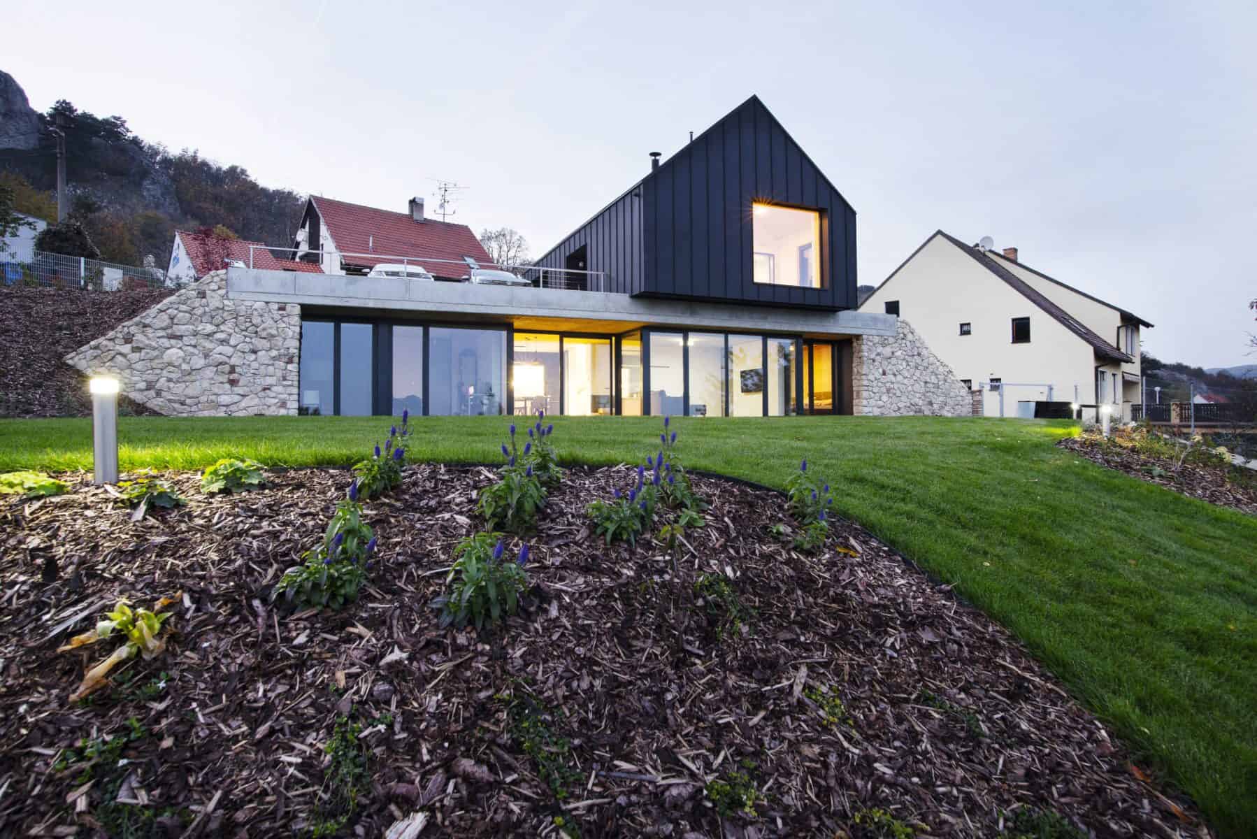 Při pohledu z dálky dům tvarově splývá s okolní zástavbou, přesto klasické venkovské stavení na první pohled zaujme jednoduchou formou s černým pláštěm. Z uliční úrovně by pod čistou linií stavby nikdo nehledal obytné podlaží zahloubené do svažité zahrady. Dvě přes sebe přeložené hmoty objektu vyšly tvořivým způsobem vstříc požadavkům investorů i náročným pravidlům CHKO.