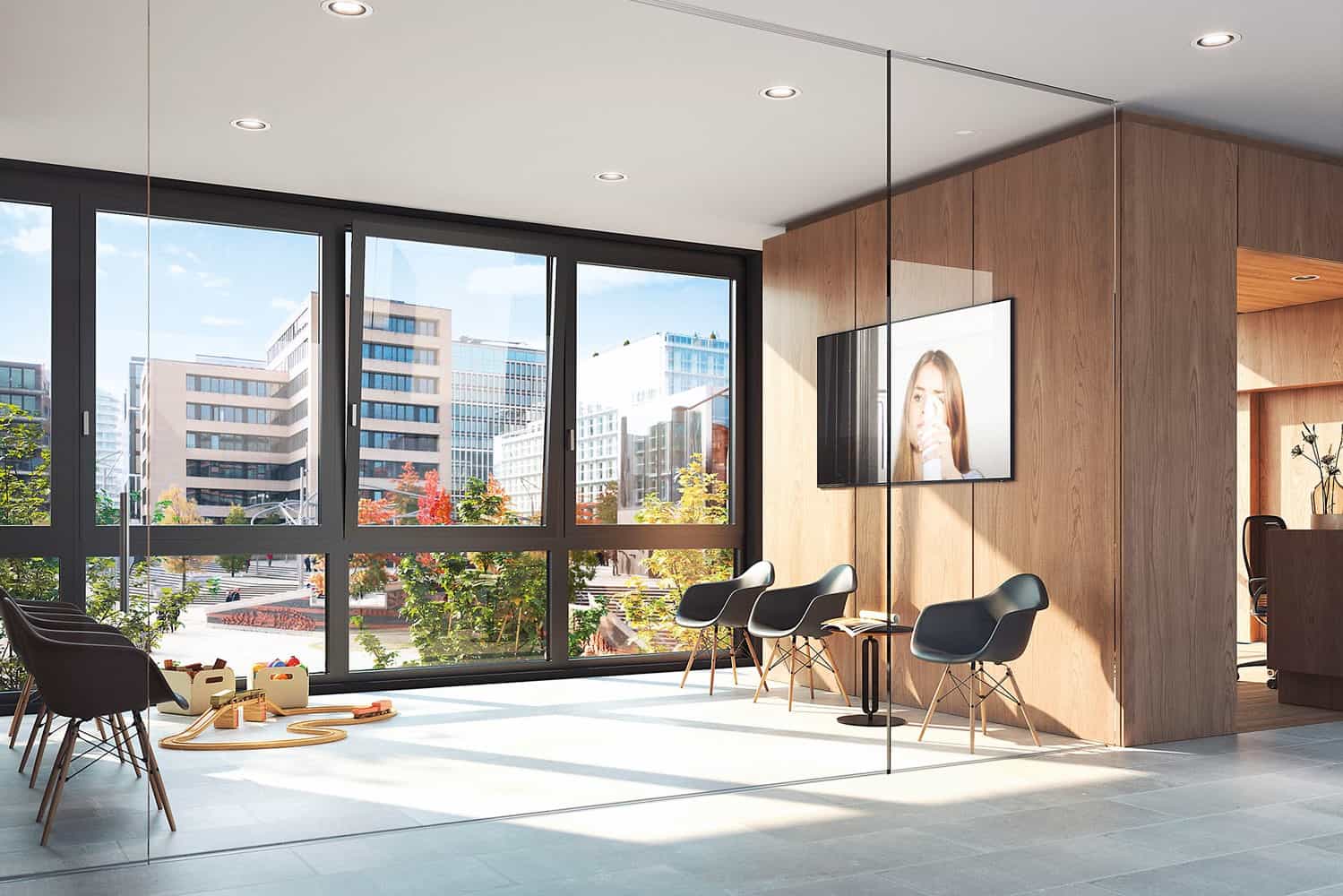 Kromě výborných zvukověizolačních vlastností nabízí Schüco SmartAktiv také dlouhodobou antibakteriální povrchovou úpravu kování i profilů hliníkových oken, dveří a posuvů (SCHÜCO)