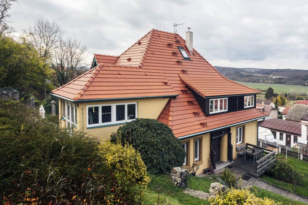 Vzorně provedená rekonstrukce střechy na vile z roku 1934. Jedná se o pálené tašky Tondach Steinbrück v režném provedení, střecha je odvětrávaná (WIENERBERGER)