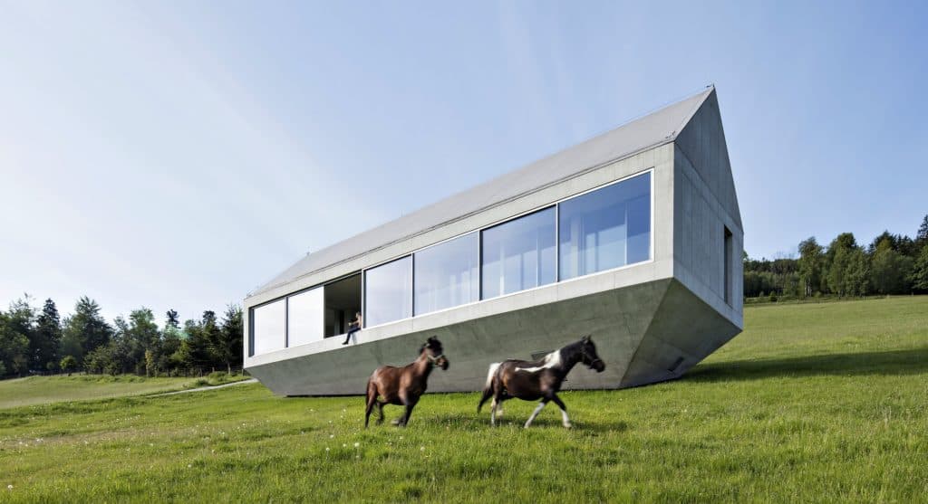 Rodina, která chová koně, se rozhodla zde zakotvit nejen kvůli výhledu, ale zejména kvůli pocitu absolutní volnosti v přírodě daleko od civilizace. který bude rámovat panoramatický obraz krajiny. Architekt Robert Konieczny vytvořil koncept obdélníkové stavby s otevřenou dispozicí, se dvěma podélnými prosklenými stěnami.