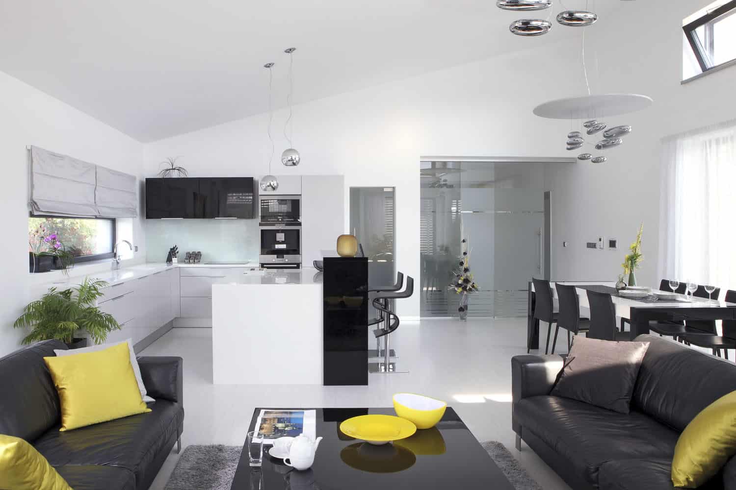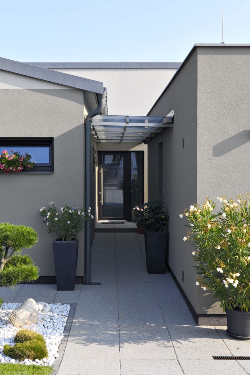 Původním přáním majitelů byl přízemní dům se sedlovou střechou. Výsledná stavba má však střechu pultovou. O jejích přednostech přesvědčil majitele architekt domu Jan Rampich. „Pultová střecha v kombinaci s plochou střechou garáže mi připadá zajímavější než množení bungalovitých chaloupek se střechou sedlovou, natož valbovou,“ vysvětluje svůj pohled.