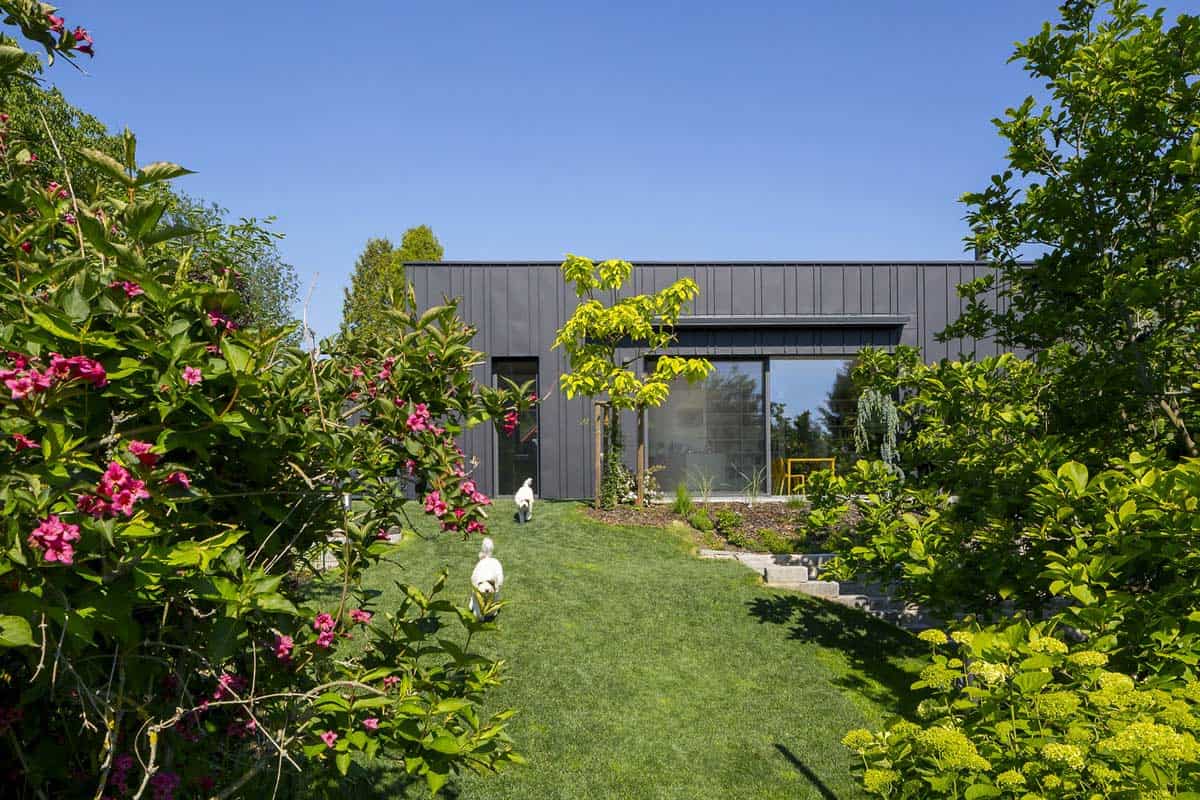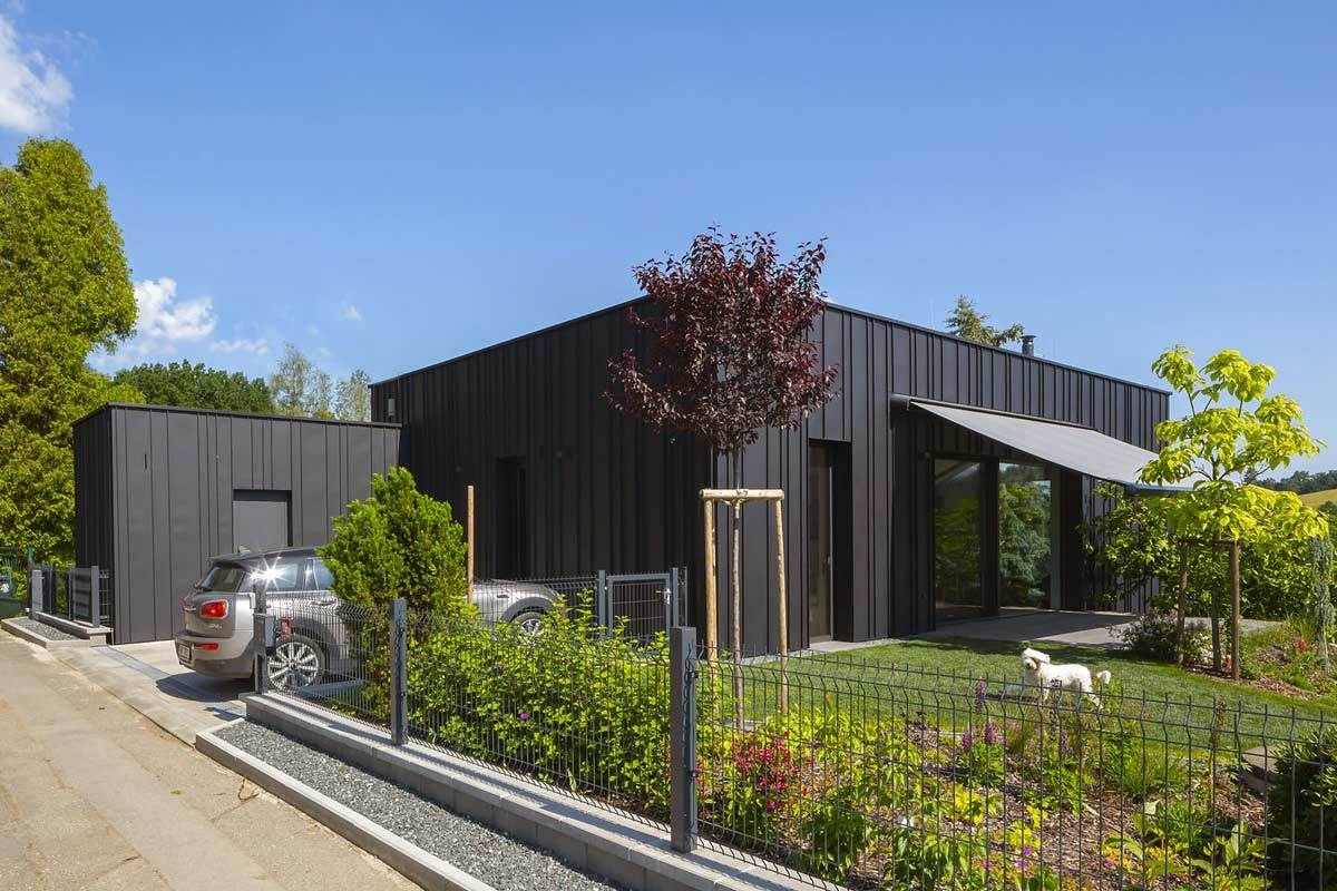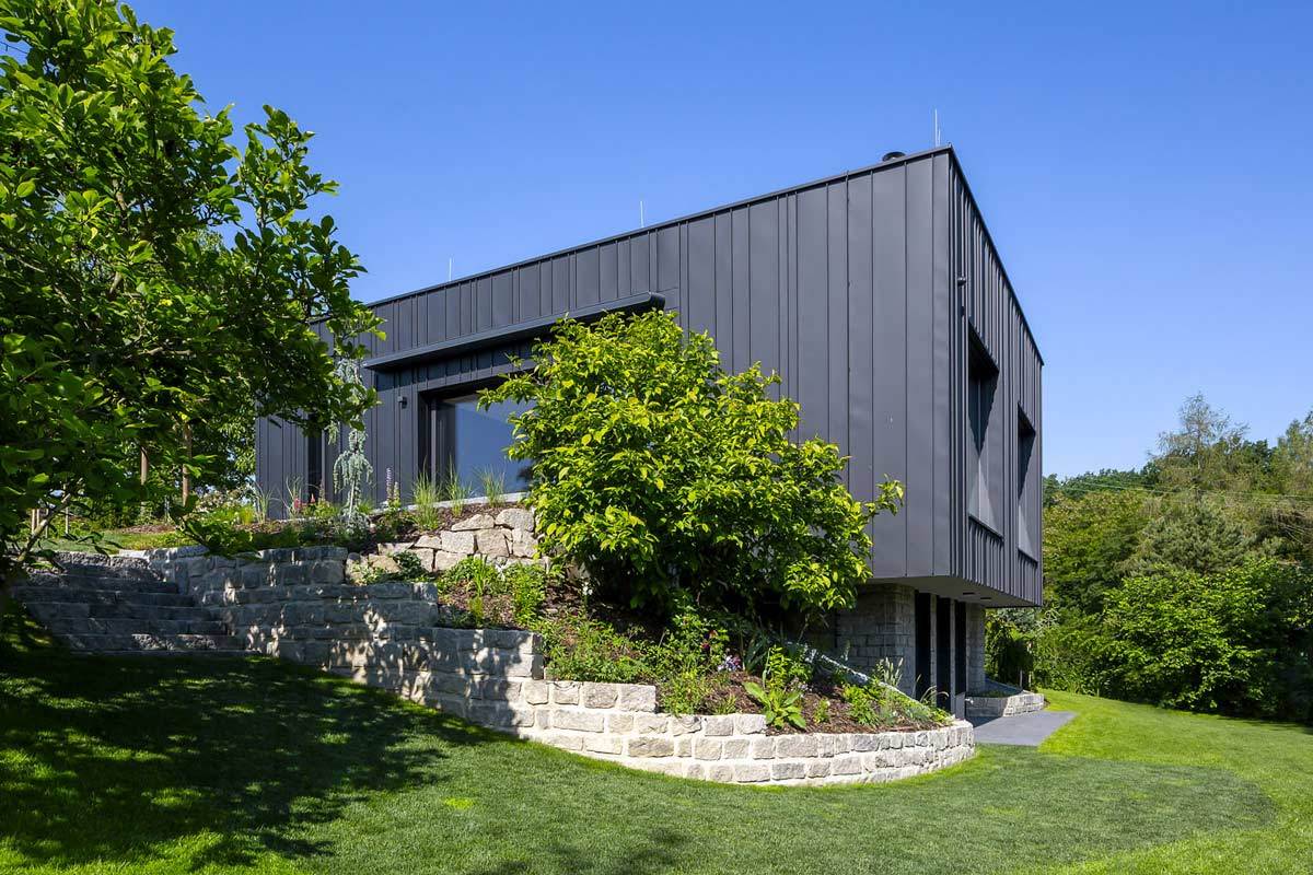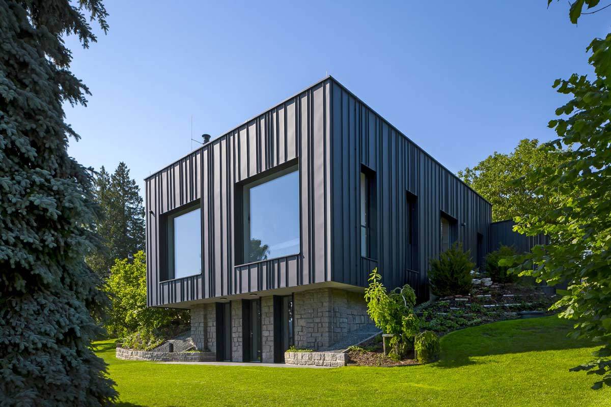Místo domu se sedlovou střechou, která – řečeno slovy územních plánovačů – způsobně „dodržuje krajinný ráz“, vyrostla v malé posázavské obci atypická stavba krychlového tvaru s černou plechovou fasádou. Původní domek z roku 1935 nahradila tak přirozeně, jako by tu stála odjakživa.