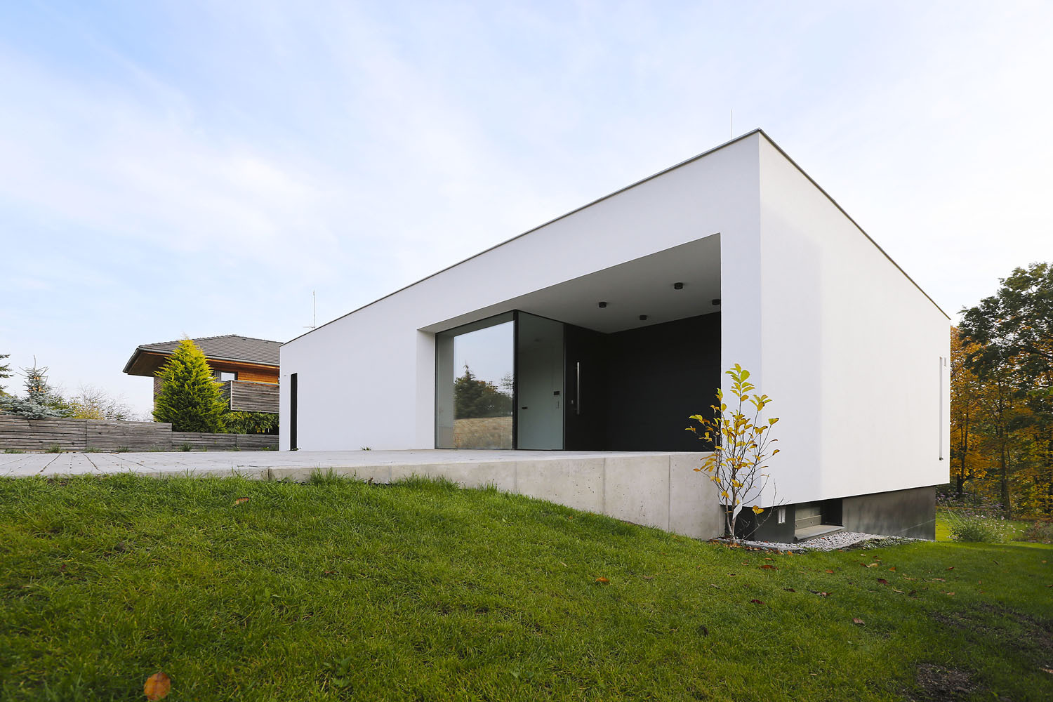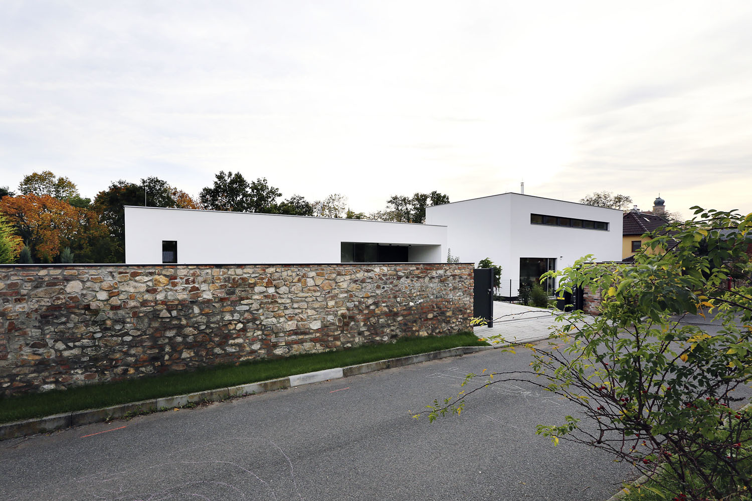 Ze severní strany, tedy od ulice, oba domy rámuje stará kamenná zeď. Sousedům se nelíbila, a tak ji zbourali, ale architekti Erika a Vladimír Vašutovi její kouzlo uměli rozpoznat. Cení si jí jako připomínky starých časů, navíc dává místu kouzlo. Pozemek se mírně svažuje k jihu, dole ho ukončuje potok, výhledy směřují ke korunám stromů a ke třem věžím barokního zámku v Mníšku pod Brdy. A stará zeď tyto kvality ještě umocňuje. Zároveň vytváří přirozený soukromý prostor.