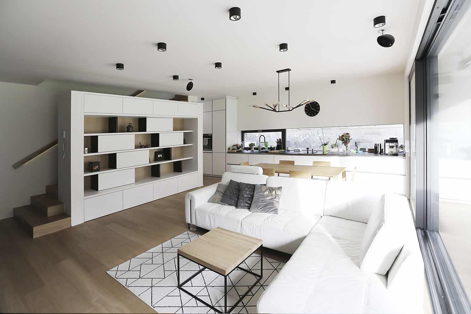 Ve vstupním podlaží se nachází dva pokoje. Nyní slouží jako ložnice rodičů a pracovna. Až děti vyrostou, budou jejich. O podlaží níže se nachází velká obytná místnost, k níž jsou přičleněny dva pokojíky pro děti, v budoucnu naopak ložnice rodičů a pracovna. Interiéry jsou opět střídmé a prosté, barevnost opět vyvážená, největší ozdobou jsou tu opět velká okna, a to včetně vstupní haly. Nábytek byl ale navržen tak, aby co nejlépe vystihoval charakter domu. Černobílé variace jsou tu pěkně rozehrané, od velkých ploch až po jemné linky s výraznou geometrií.