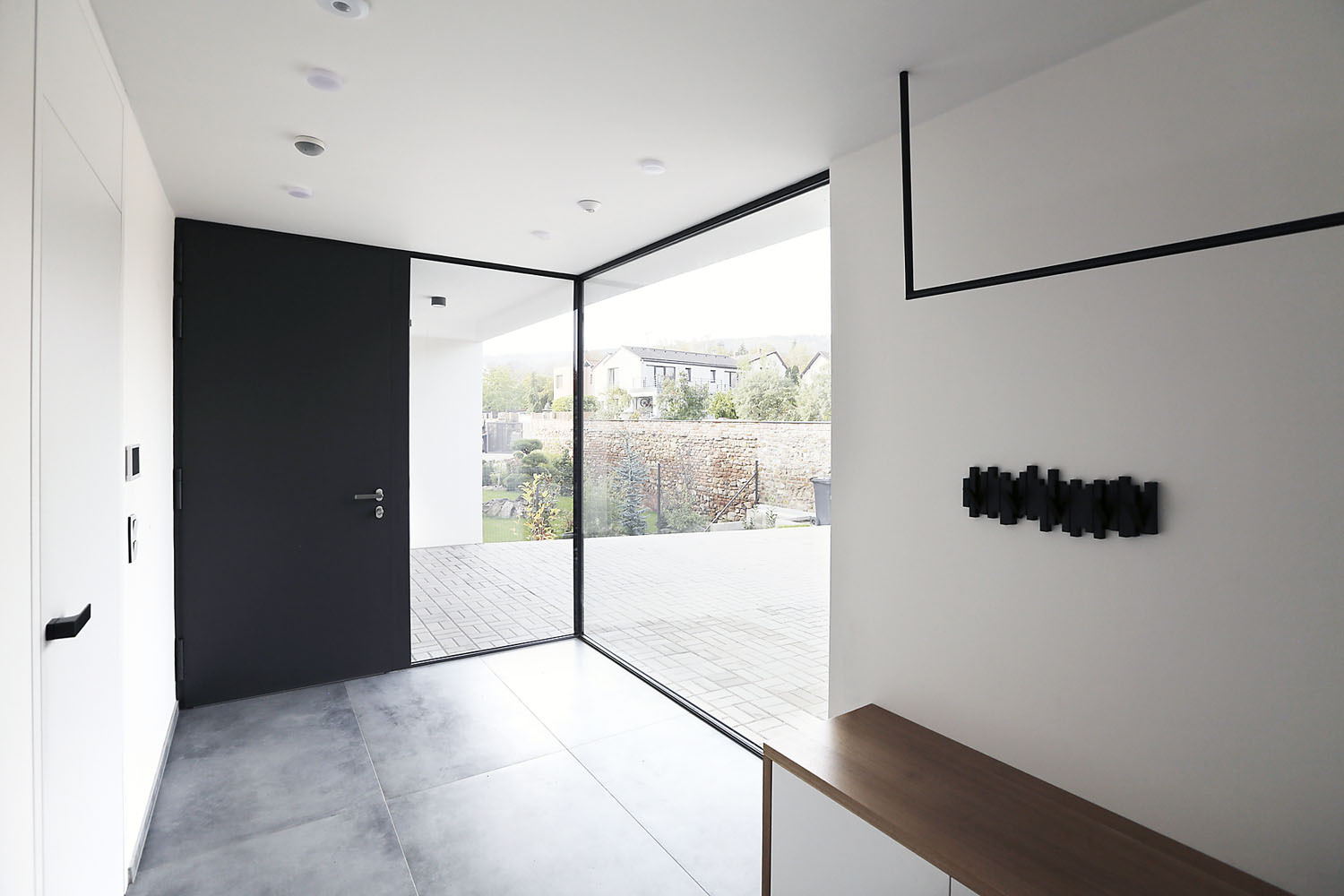 Druhý dům vznikl později, dokončen byl letos. Staršímu bratrovi je podobný, ale umí překvapit. Už jenom tím, že se vstupuje do horního podlaží, kde je i příjezd a garáž. Za novými vraty ve staré zdi nás vítá prosklený vstupní prostor, který působí přátelsky a otevřeně.