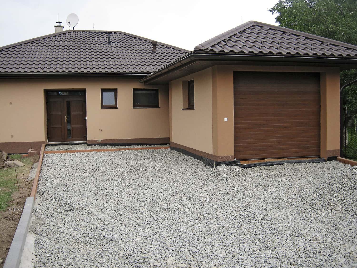 Před vstupem do domu a vjezdem do garáže je velká zpevněná plocha vyspádovaná směrem od domu a ohraničená betonovými obrubníky. Podklad tvoří zhutněný štěrkový násyp