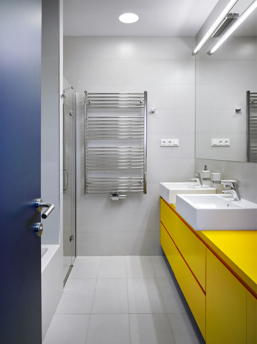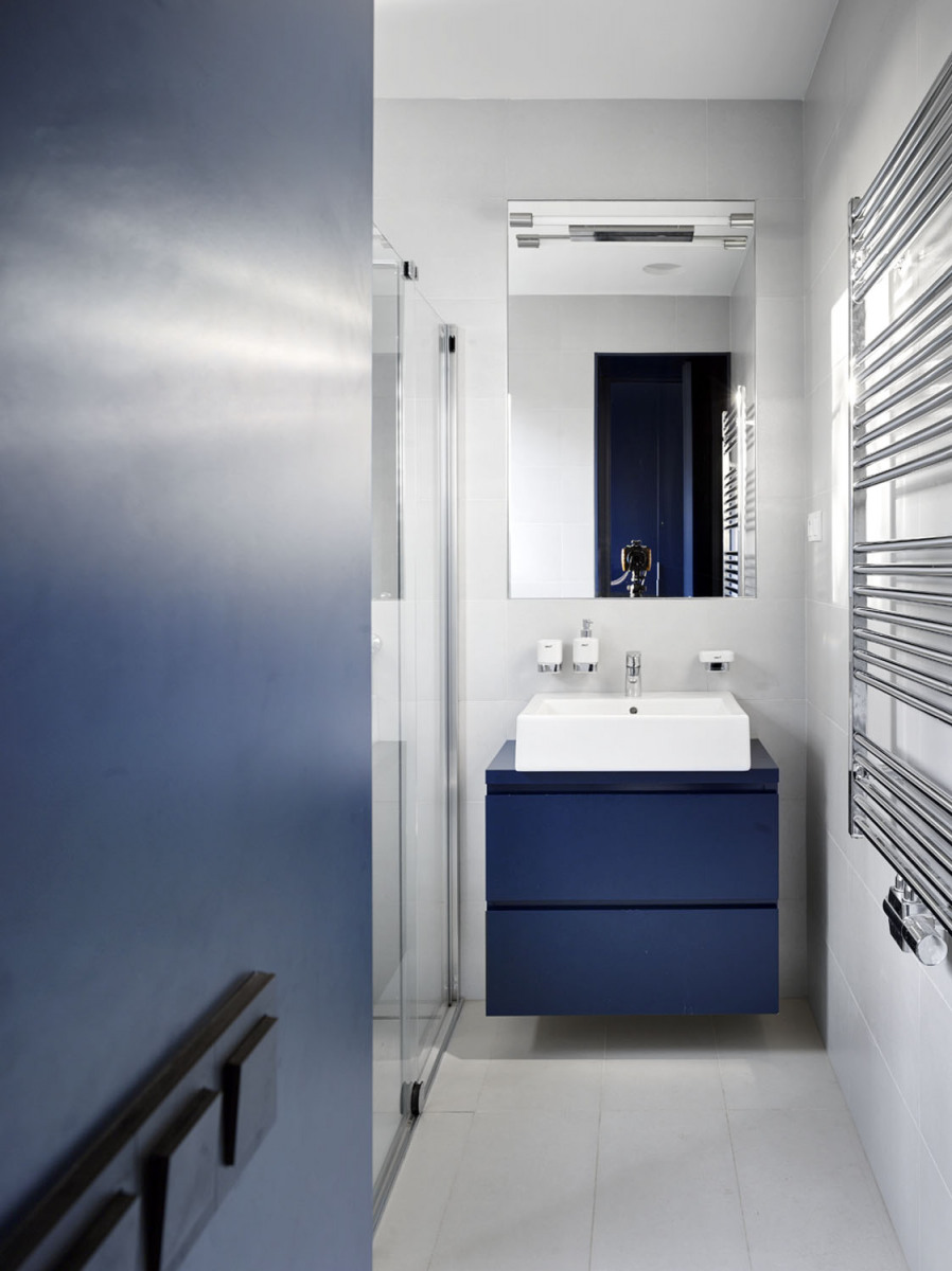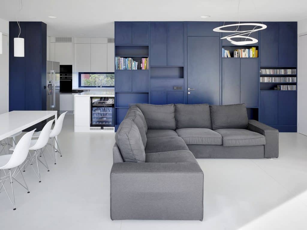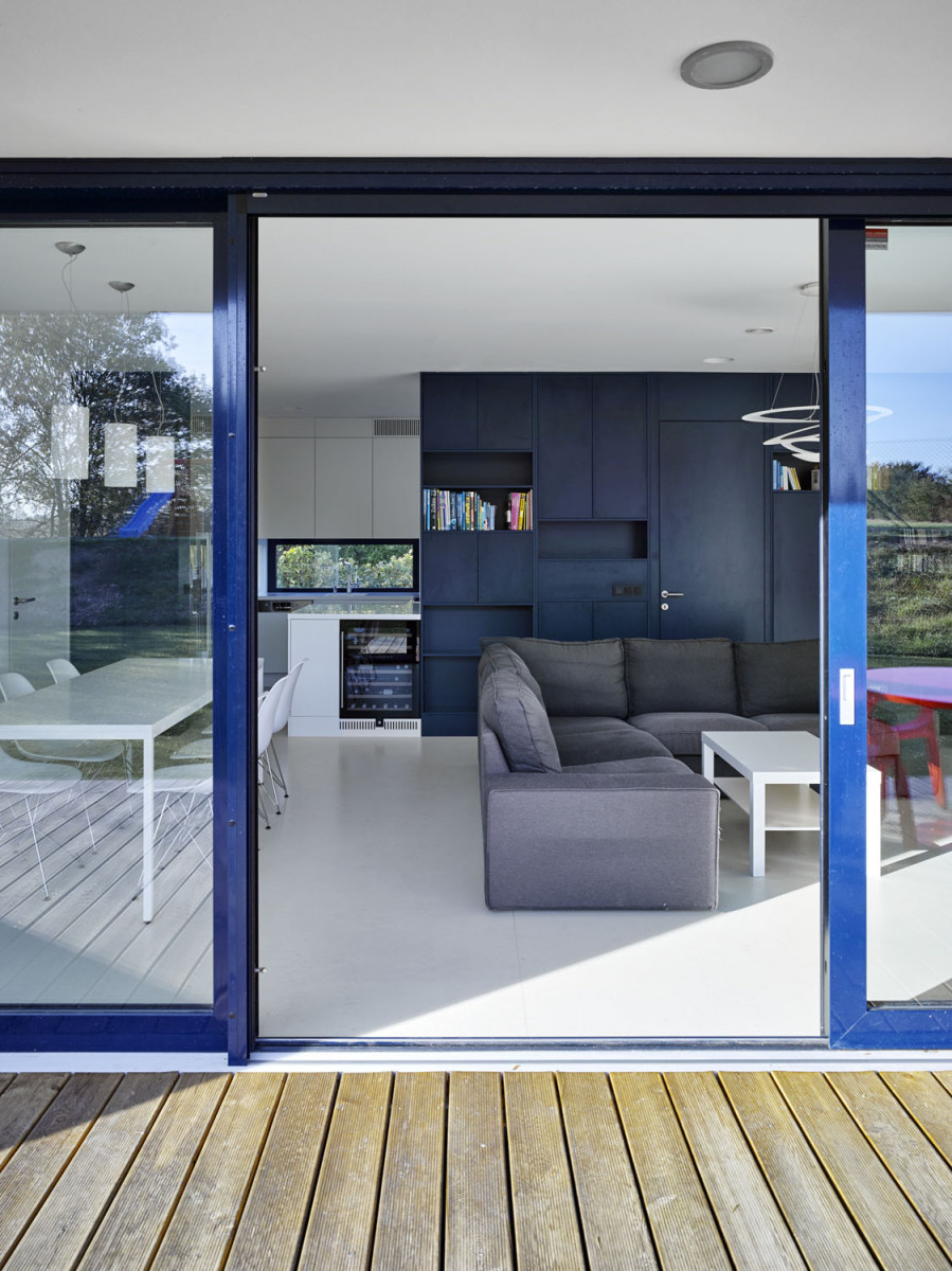 Jako kontrast k bělostné hladké fasádě architekti zvolili tmavě modré okenní rámy, které dodávají jednoduché stavbě výrazný vzhled. Modrobílá barevná kombinace se opakuje i v interiéru, který byl z převážné části zařízen vybavením vyrobeným na zakázku podle návrhu architektů. Hladké podlahy z bílé stěrky kontrastují s nábytkem, řada vestavěných skříní a dveří je zvýrazněna tmavě modrým matným lakem. Kompozici doplňuje zářivý žlutý akcent, odstín slunce a optimismu.