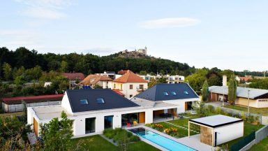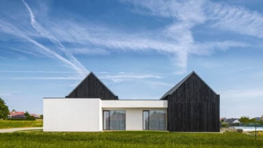 Plochá i sedlová střecha, dřevo a omítka, černá i bílá fasáda – kontrast i harmonie. V malé obci na jižní Moravě vznikl rodinný dům, který originálním způsobem respektuje ducha lokality, a zároveň přináší současné architektonické hodnoty a moderní komfort. Tři obdélníkové budovy se sedlovými střechami obklopují centrální dvůr, na čtvrté…