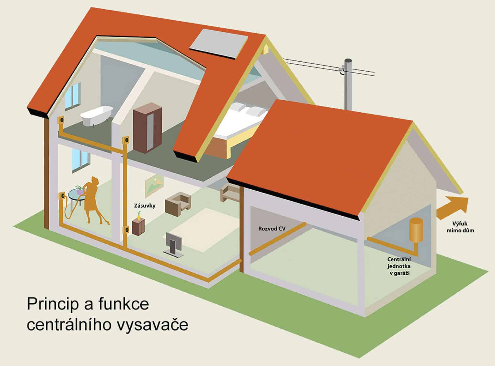 Systém centrálního vysávání se skládá ze zásuvek, trubních rozvodů, centrální jednotky se sběrnou nádobou (agregátu) a vyfukovacího otvoru na stěně domu