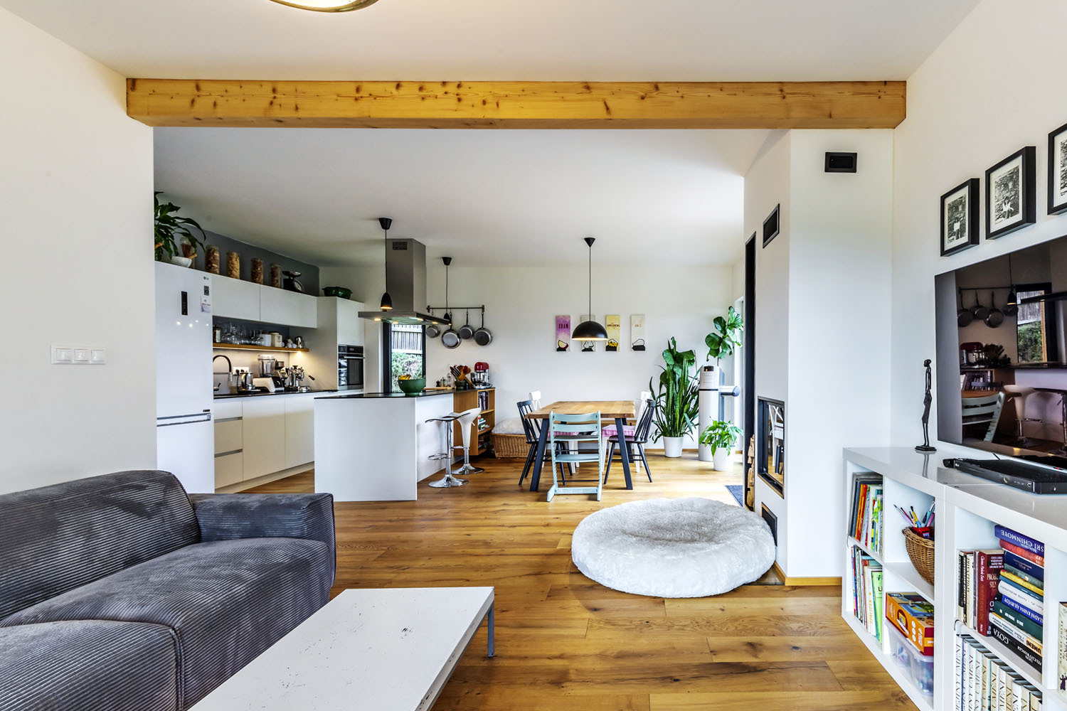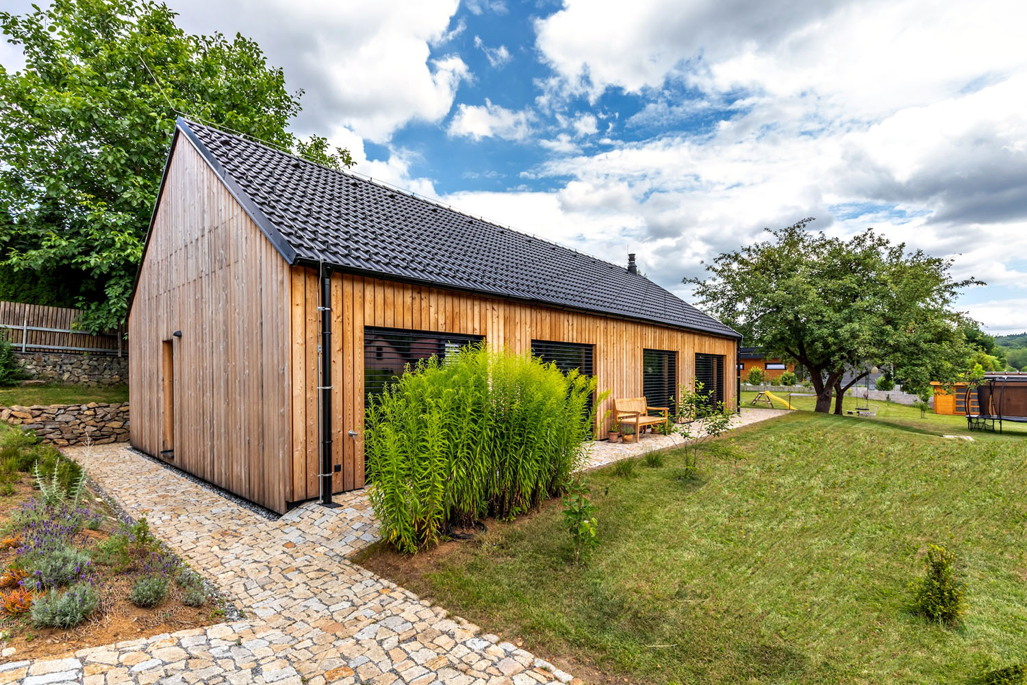 Mladá rodina našla pozemek v lokalitě, která je součástí obce s dobrou vybaveností – jsou tu obchody, škola, pošta a dobré vlakové i autobusové spojení do Prahy. Líbilo se jim klidné místo s výhledem na kopcovitou, dosud relativně málo zastavěnou krajinu, kde máte stále ještě pocit sblížení s přírodou. Na dosah jsou bohaté lesy, turistické stezky nebo třeba koupání v Sázavě. Přáli si pohodlné a zdravé bydlení s nízkými provozními náklady, a proto se poohlíželi po bezbariérových dřevostavbách.