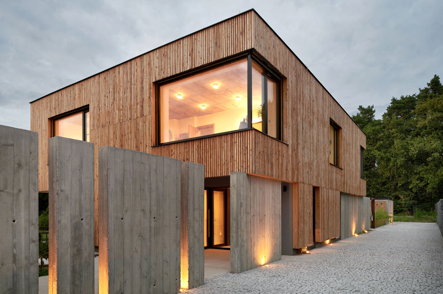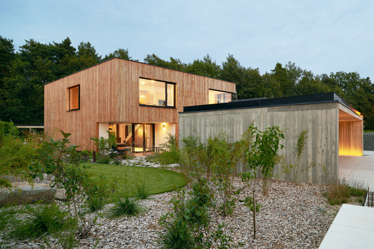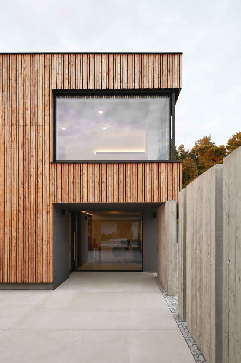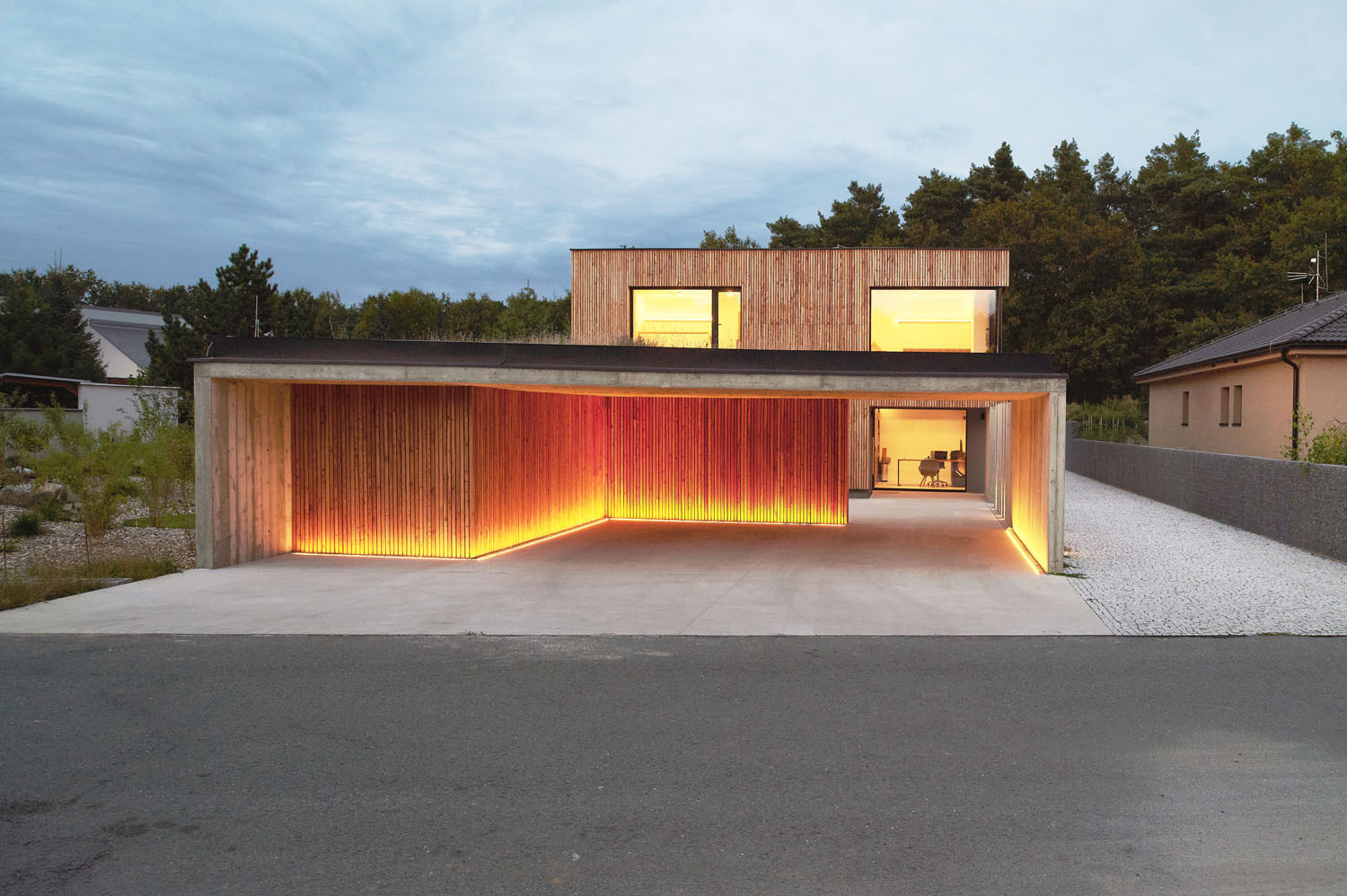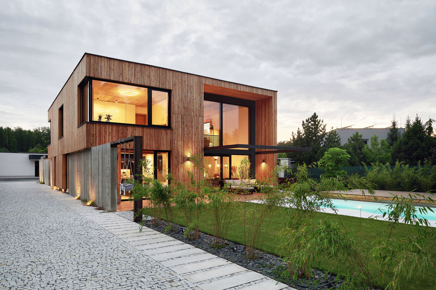 Moderní rodinný dům s plochou střechou se postupně zanoří do zeleně, která jej obklopuje. Stavba těží z kontrastu (a souladu) surového pohledového betonu s dřevěnými plochami. Pozemek je domem rozdělen do tří zón s odlišnou náladou.
