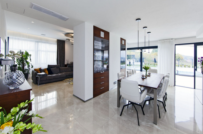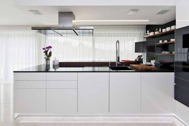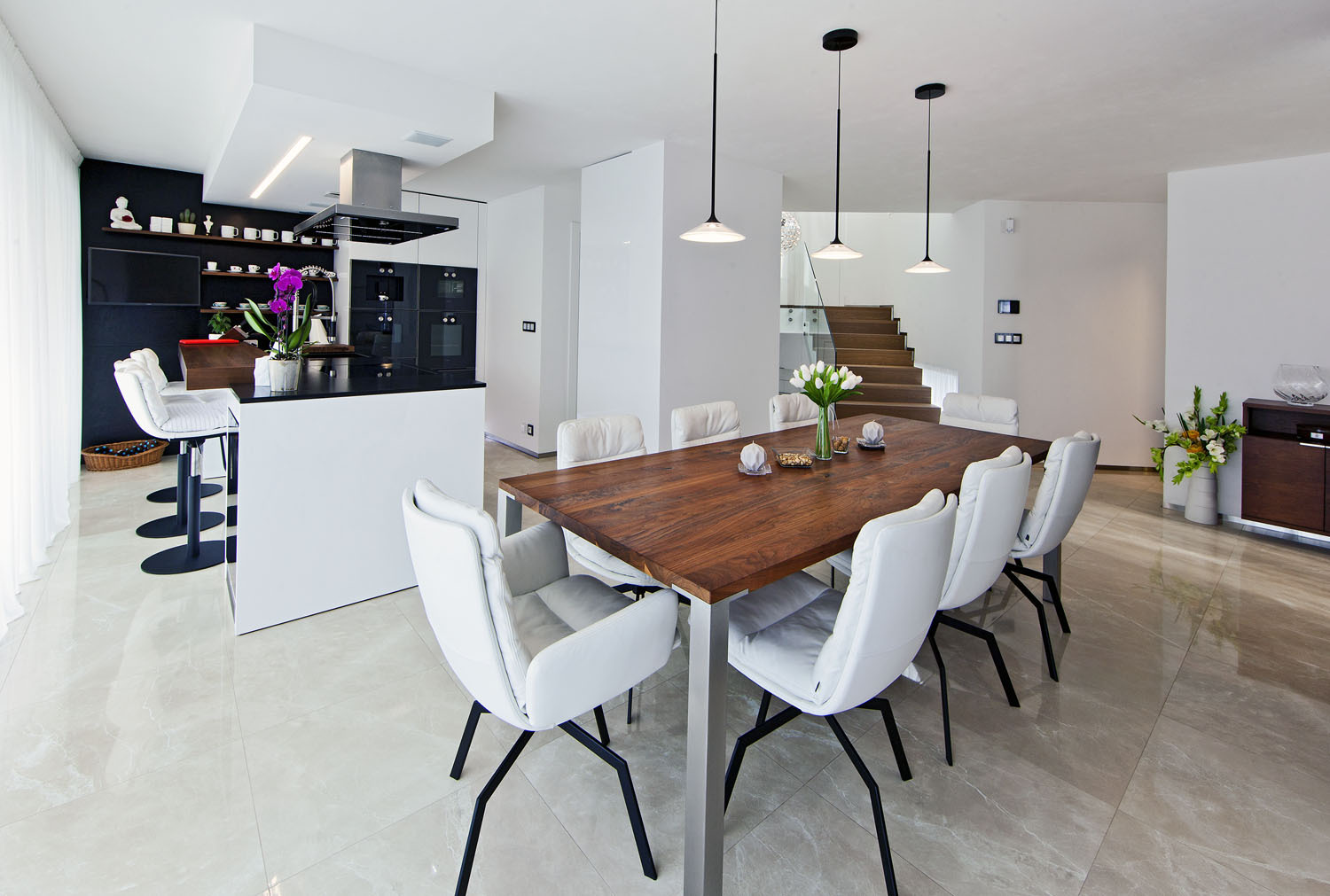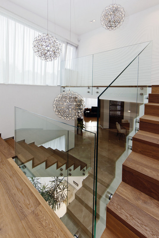 Jak u samotné stavby, tak v interiéru kladli stavebníci velký důraz na čistotu a přesnost. „Interiér řešíme postupně, chtěli jsme dům napřed procítit a pak dovybavit,“ vysvětluje paní domu. „Vyrůstala jsem v kulturním prostředí, ve funkcionalistickém domě, proto mám ráda zajímavé solitéry a výtvarné prvky. Ještě čekáme na obrazy, které dodají domu ducha a teplo.“