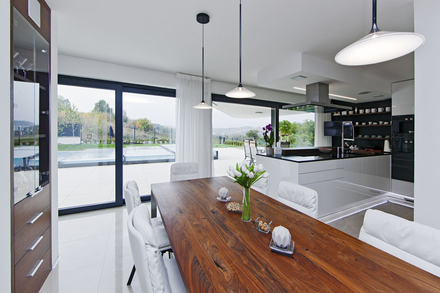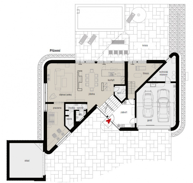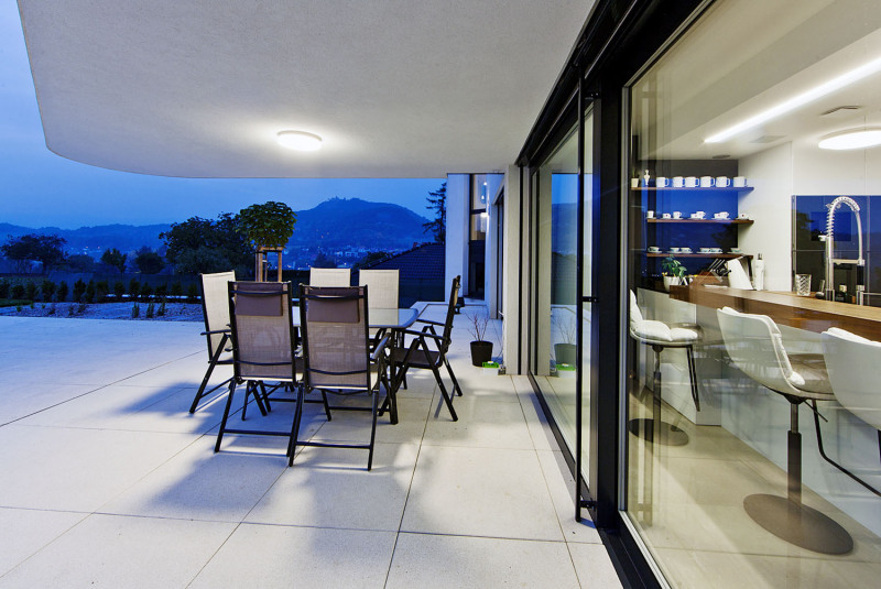 V přízemí se nachází velká dvougaráž s technickým zázemím a společná denní zóna, která prosklenou stěnou navazuje na velkou terasu a zahradu vzadu za domem. „Krásný výhled do krajiny je pro nás rozhodující, takže orientace hlavního obývacího prostoru na severozápad nám vůbec nevadí. Naopak máme rádi stín a slunce si tu užíváme ráno a vpodvečer,“ vyprávějí majitelé. Kuchyň s varným ostrůvkem přímo sousedí s velkým jídelním stolem, sezení je umístěno v zadní části tohoto prostoru a částečně odděleno polopříčkou, aby vznikla klidová zóna pro odpočinek, čtení, poslech hudby a podobně. V přízemí je také domácí fitness, pracovna a sauna se zázemím.