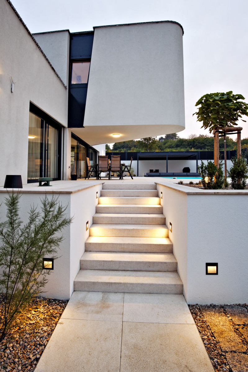 Se stejným přístupem prováděli také zahradní úpravy. Svažitý terén byl srovnán do roviny, aby za domem mohla vzniknout široká terasa s bazénem, bezbariérově přecházející v rekreační travnatou plochu. Podél severozápadní hranice pozemku byla vybudována mohutná, 3 metry vysoká a 70 metrů dlouhá opěrná zeď, která uvolnila místo pro zpevněnou plochu s velkou pergolou, grilem a odpočinkovým zákoutím v japonském stylu. Výrazně se tak rozšířil a zhodnotil venkovní obytný prostor, kde se nikdo nebude nudit.