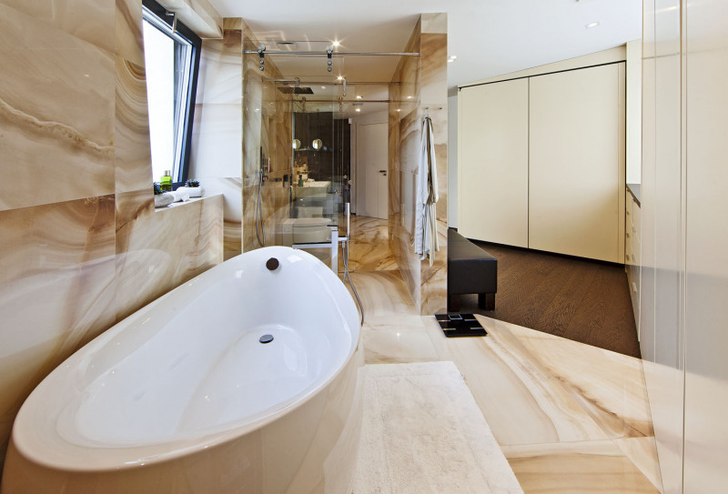 ▪ Výplně otvorů: okna a prosklené plochy – hliníkové Schüco s izolačními trojskly, bezbariérové posuvné plochy s HS portály, předokenní žaluzie na automatické ovládání, vnitřní dveře atypické na míru