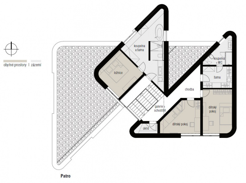 Po otevřeném schodišti se vychází o půl patra výše do „dětského“ podlaží se dvěma pokoji synů, koupelnou a šatnou. O dalších osm stupňů výše se nachází ložnicová zóna rodičů. Architekt tu zajímavě propojil šatnu s koupelnou, která zaujímá severní trojúhelníkový „cíp“ domu. Druhé podlaží v tomto bodě výrazně přesahuje přes přízemí a expanduje do volného prostoru. Konstrukčně náročný a výtvarně působivý prvek nevznikl samoúčelně, ale má praktický účel – stíní terasu u jídelny.