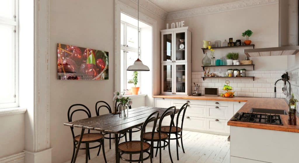 Skleněný sálavý panel ECOSUN GS v bezrámovém provedení, opatřený motivem ovoce, tvoří na stěně v kuchyni svěží dekoraci (FENIX)