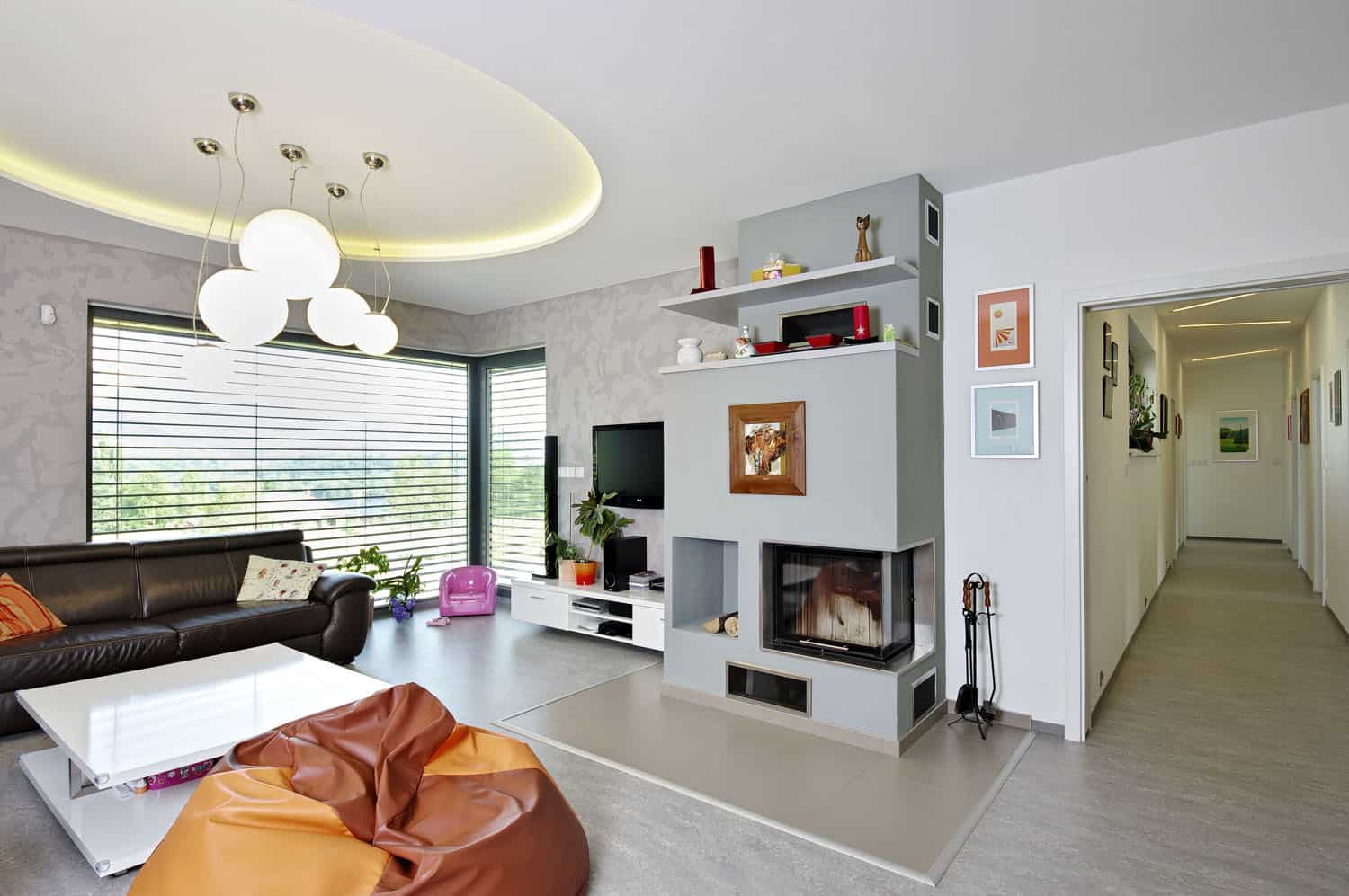Severojižní orientace podélné osy domu splňuje představu majitelů o příjemném bydlení. Boční stěny zůstávají víceméně uzavřeny, širokým výhledům se otevírá pouze východní průčelí stavby, zatímco západní strana směřující do svahu nabízí obyvatelům domu soukromí. „Jedním z hlavních požadavků byla dostatečná ochrana stavby před slunečními paprsky. Proto jsme pro konstrukci zvolili vápenopískové cihly, které dobře akumulují teplo i chlad. Bungalov se sedlovou střechou má tendenci k přehřívání, díky dostatečné izolaci a akumulačnímu materiálu se nám ale podařilo vytvořit chladný interiér prověřený i loňským horkým létem,“ říká Michal Janáč.