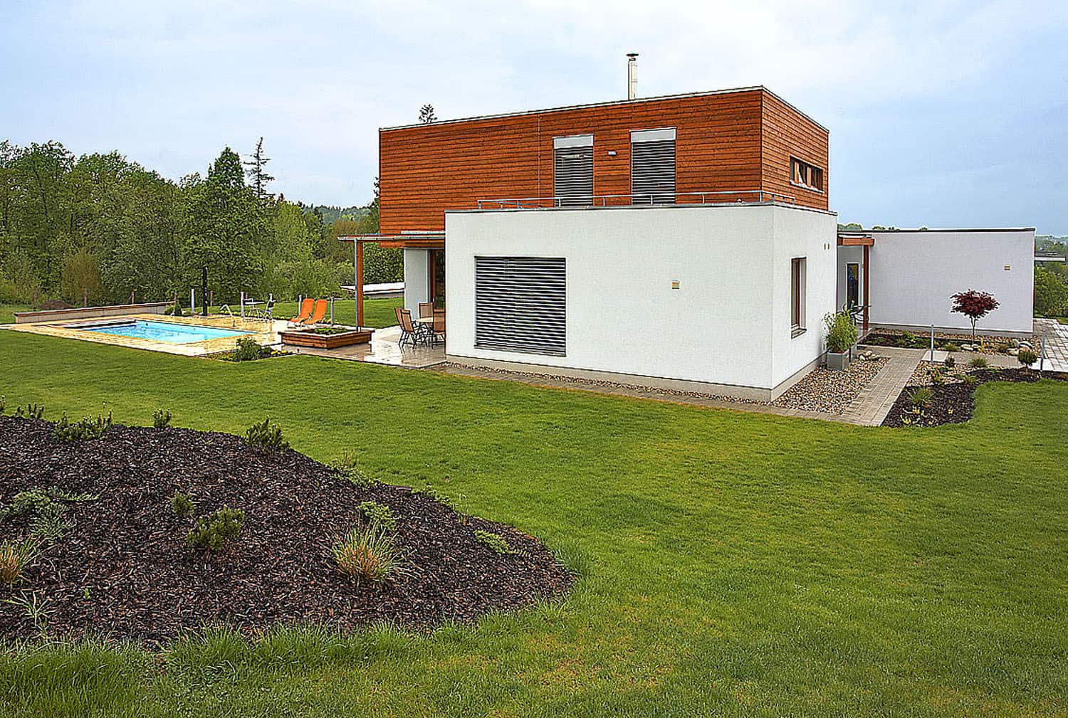 Pozemek v mírném severním svahu má sice souseda, díky pozici vymezené na západní straně lesem, na východě silnicí a ze severu otevřené do dáli směrem k hřebenům Beskyd se ale ocitá takřka na okraji civilizace. Tiché místo, kde srnky a bažanti možná způsobí během dne víc hluku než projíždějící auta, by mohlo mnohé inspirovat k představě tradiční dřevěné chaloupky.