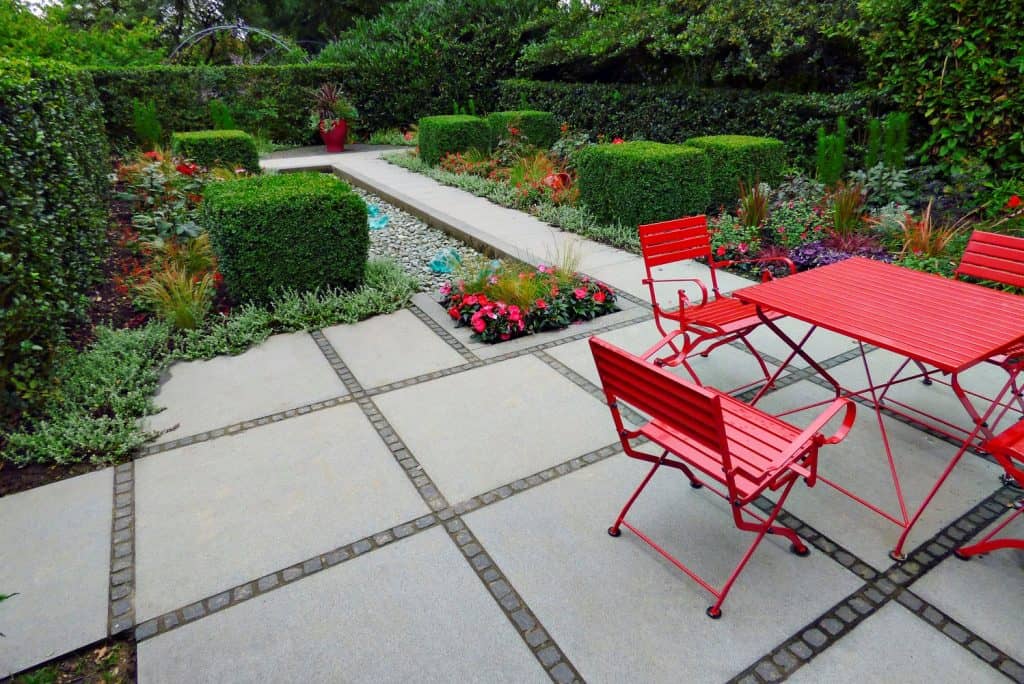 Pro vytvoření rovné plochy, která se i dobře čistí a uklízí, se výborně hodí velkoformátové betonové dlaždice. Pásky z přírodních kostek vytvářejí zajímavý dekor a zároveň slouží jako dilatační spára