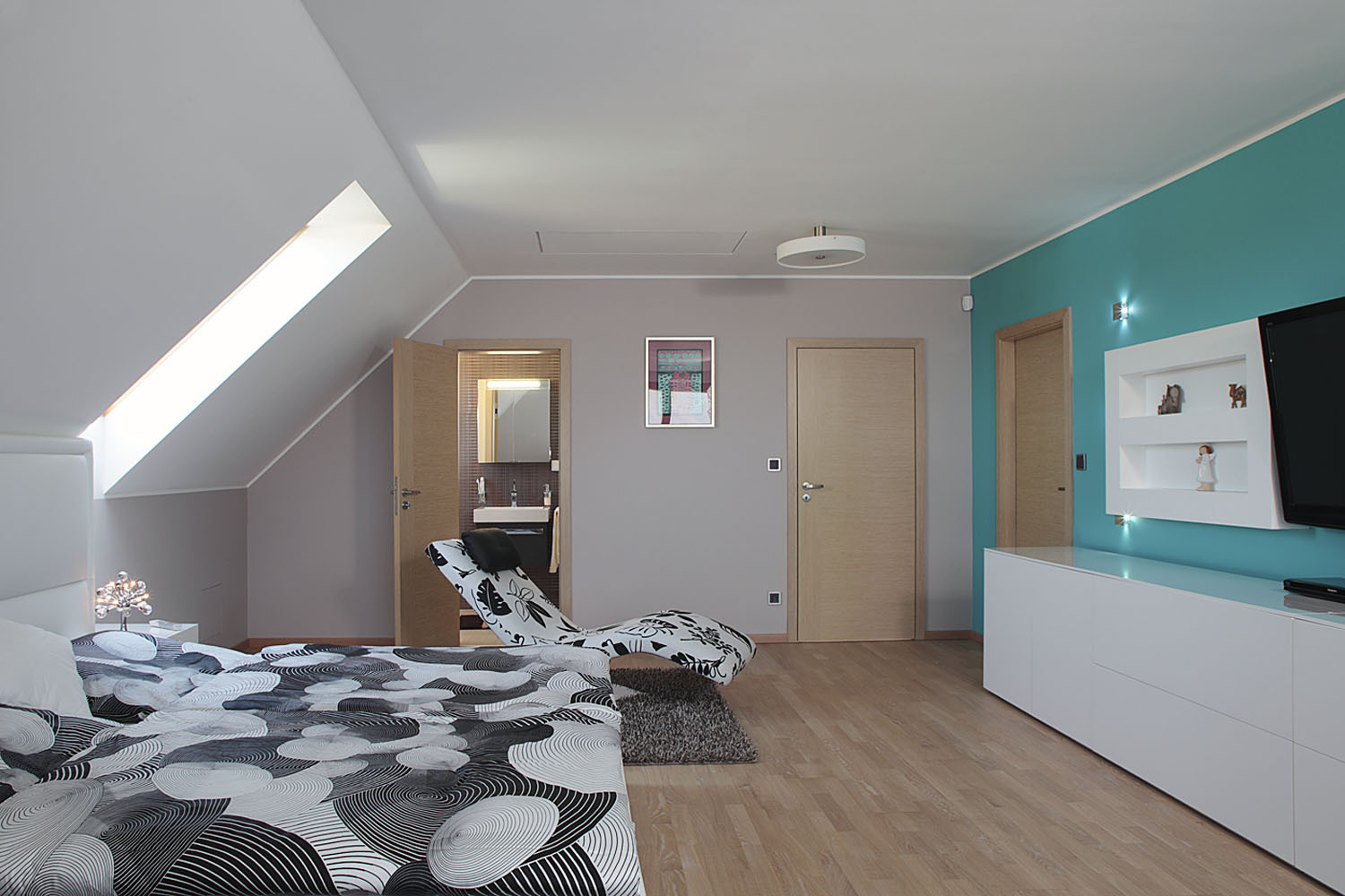 Dům postavený v nové zástavbě nedaleko Prahy využívá převážně osvědčené tradiční materiály a na první pohled nemíří k avantgardě. Překvapí vás velkorysým prostorovým řešením, které mladé rodině poskytuje klidné zázemí a dokonalý komfort jak uvnitř, tak na zahradě.