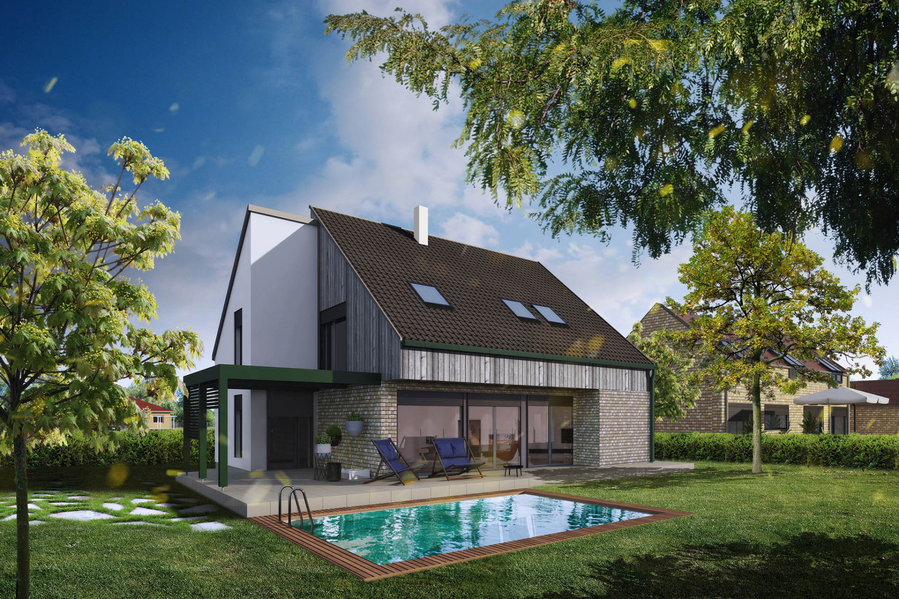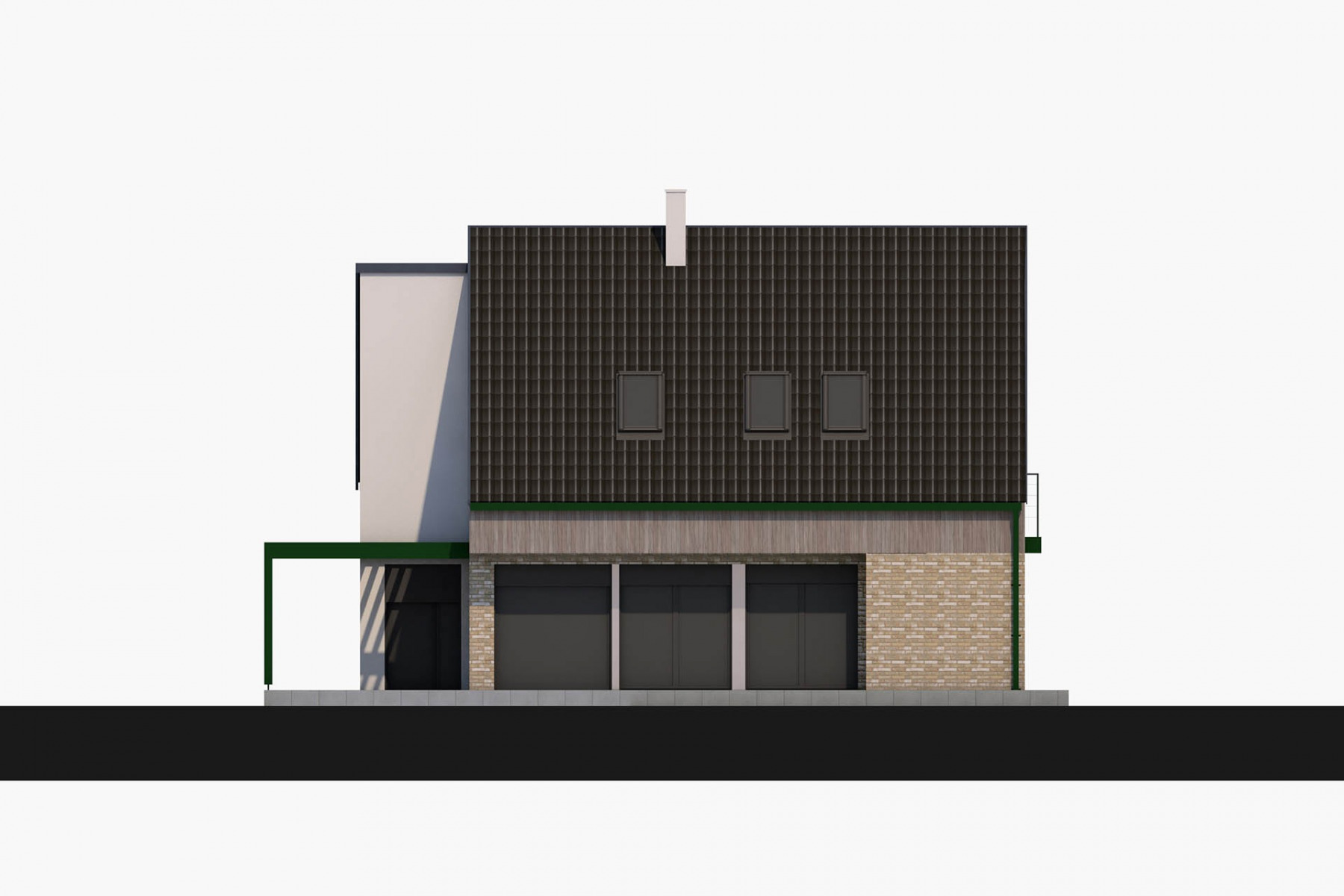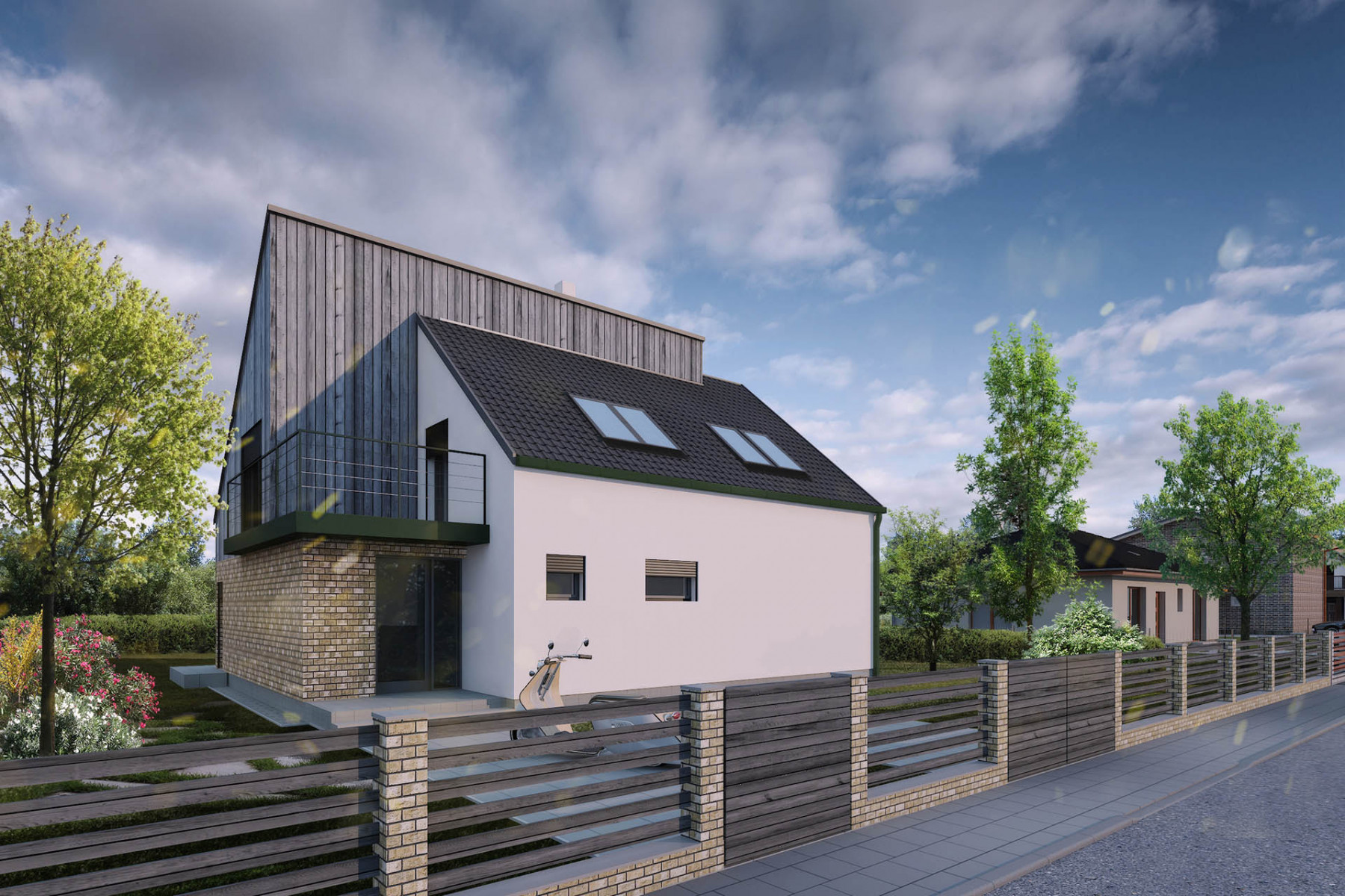 Dům dobře zapadne do města i na venkov a uspokojí nároky na moderní bydlení pro čtyřčlennou rodinu. Velký společný obývací prostor v přízemí je promyšleně rozdělen na kuchyňskou část a sezení, ke kladům patří také chráněná rohová terasa, pohodlné zázemí a dostatek úložného prostoru.