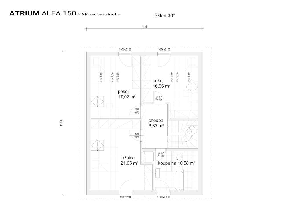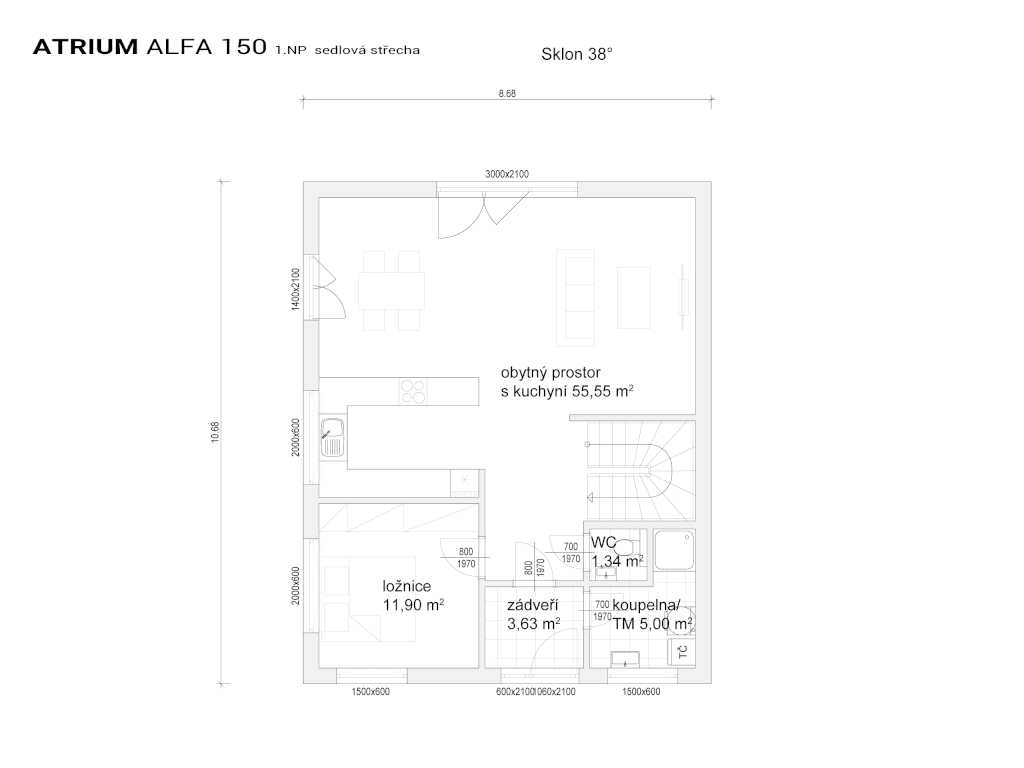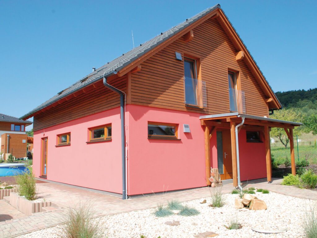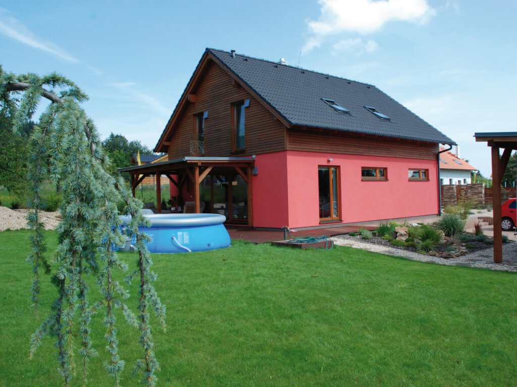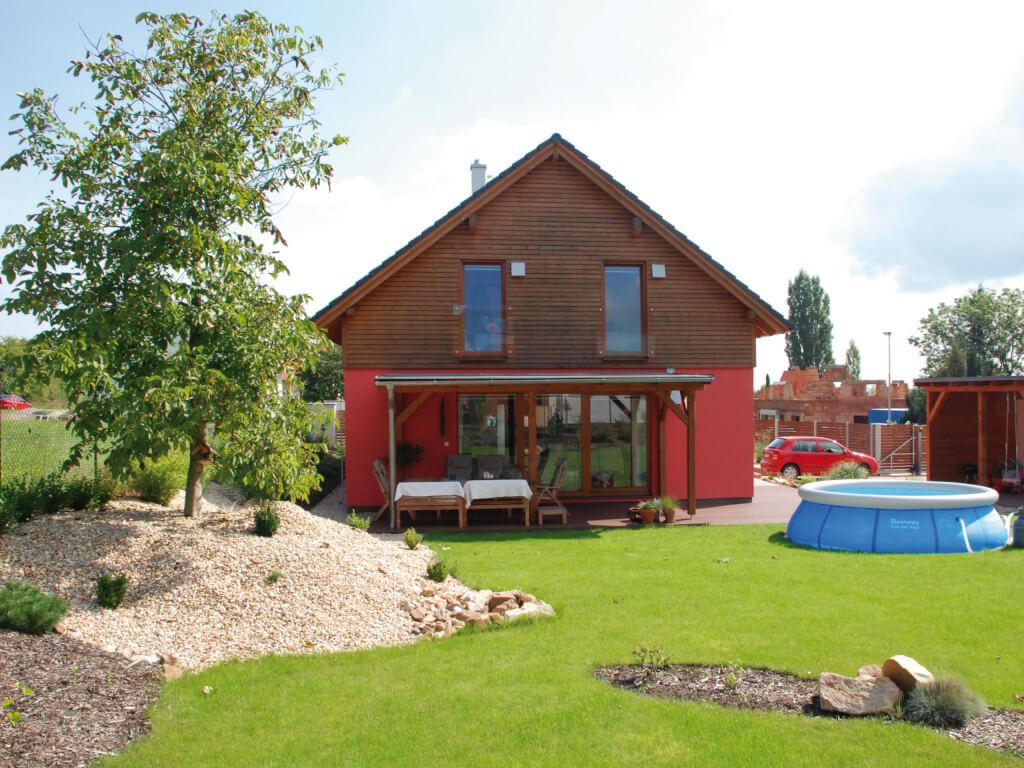 Stále velmi oblíbený rodinný dům se sedlovou střechou s názvem Alfa 150 má své zájemce mezi všemi generacemi. Tento dům doznal již mnoho různě upravených realizací, ale díky svému nadčasovému vzhledu a vnitřnímu uspořádání bude stále žádanou dřevostavbou. V přízemí je zajímavě řešená kuchyň, která má tvar „U“. Paní domu má od kuchyňské linky přehled po celém obývacím pokoji. Z tohoto prostorného společného pokoje se projde na venkovní krytou terasu s výhledem na zahradu. V přízemí je pokoj, který si zařídíte třeba jako ložnici nebo pracovnu. V podkroví jsou tři velké ložnice a prostorná koupelna. Alfa 150 bude díky praktickým dispozicím příjemným domovem i pro pěti až šesti člennou rodinu.
