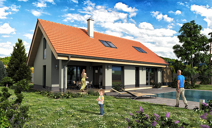 Díky možnosti zvolit různý tvar střechy dům dobře zapadne do městského i venkovského prostředí. Dispozice nabízí nadstandardní komfort pro až pětičlennou rodinu – velké pokoje a pohodlné zázemí včetně potřebného úložného prostoru.