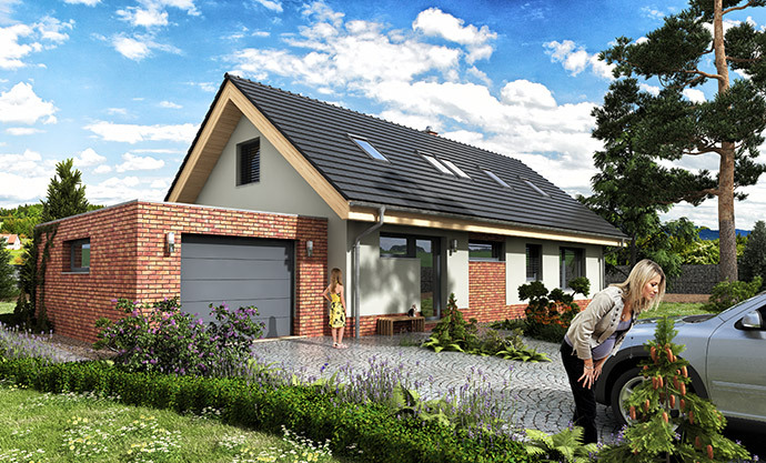 Nadčasový dům pro pohodlné a praktické bydlení. K benefitům patří velký společný obývací prostor přehledně uspořádaný do tvaru L, krytá terasa a hodně úložného prostoru. Jako jeden z mála katalogových domů zahrnuje i garáž pro dva automobily.