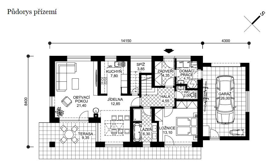 Dům dobře zapadne do města i na venkov a uspokojí nároky na moderní bydlení pro čtyřčlennou rodinu. Velký společný obývací prostor v přízemí je promyšleně rozdělen na kuchyňskou část a sezení, ke kladům patří také chráněná rohová terasa, pohodlné zázemí a dostatek úložného prostoru.