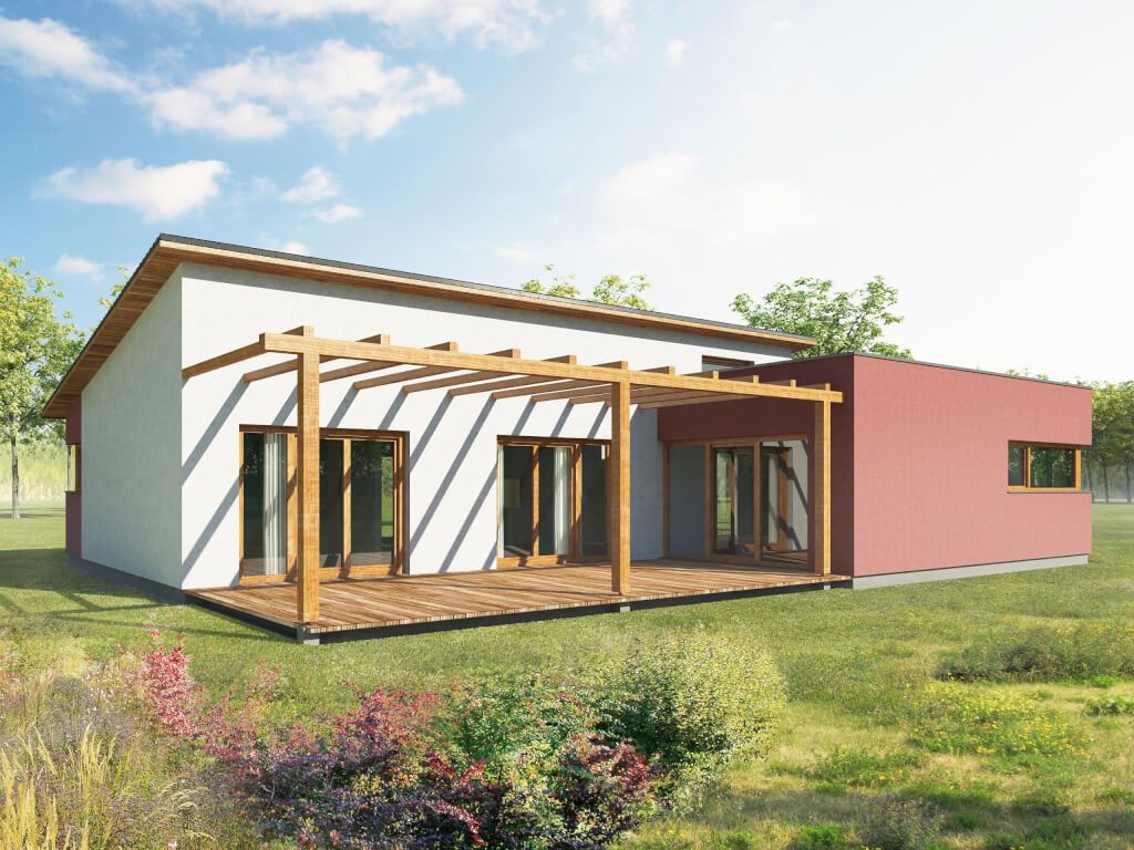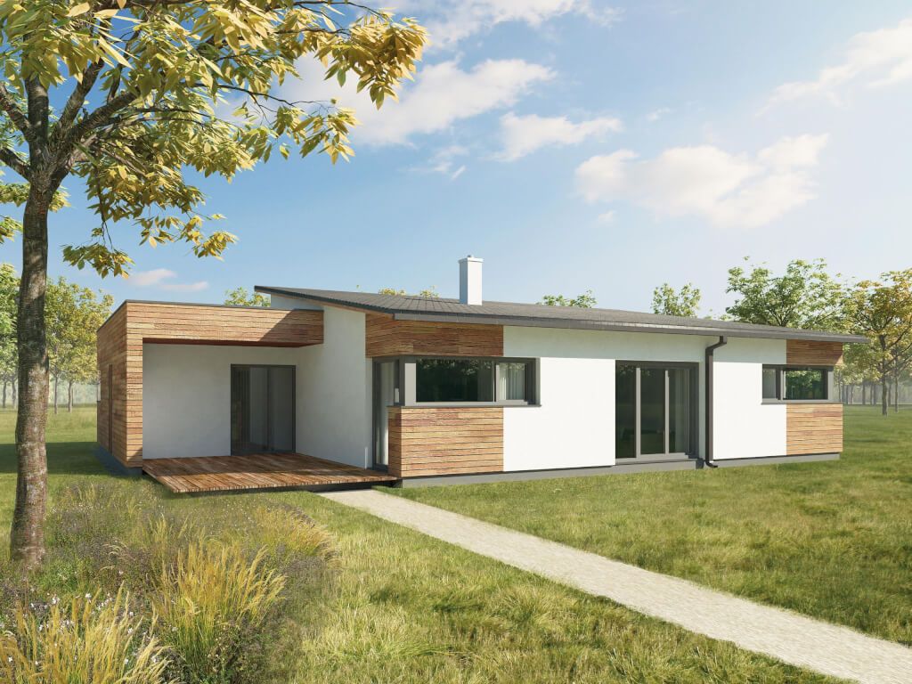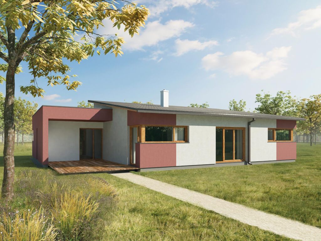 Nadčasový bungalov nabídne pohodlné bezbariérové bydlení rodině s jedním až dvěma dětmi, případně umožňuje společné bydlení se star... ými rodiči. Od standardních řešení se odlišuje velkou samostatnou kuchyní a velkým obývacím pokojem, z něhož vedou dva výstupy na opačné strany zahrady. Dispozice je tedy vhodná pro různou orientaci pozemku ke světovým stranám a také umožňuje mít dvě terasy. Každá ložnice má svou koupelnu s WC.