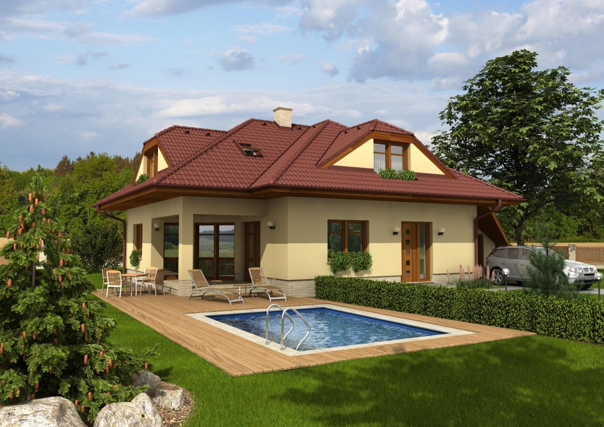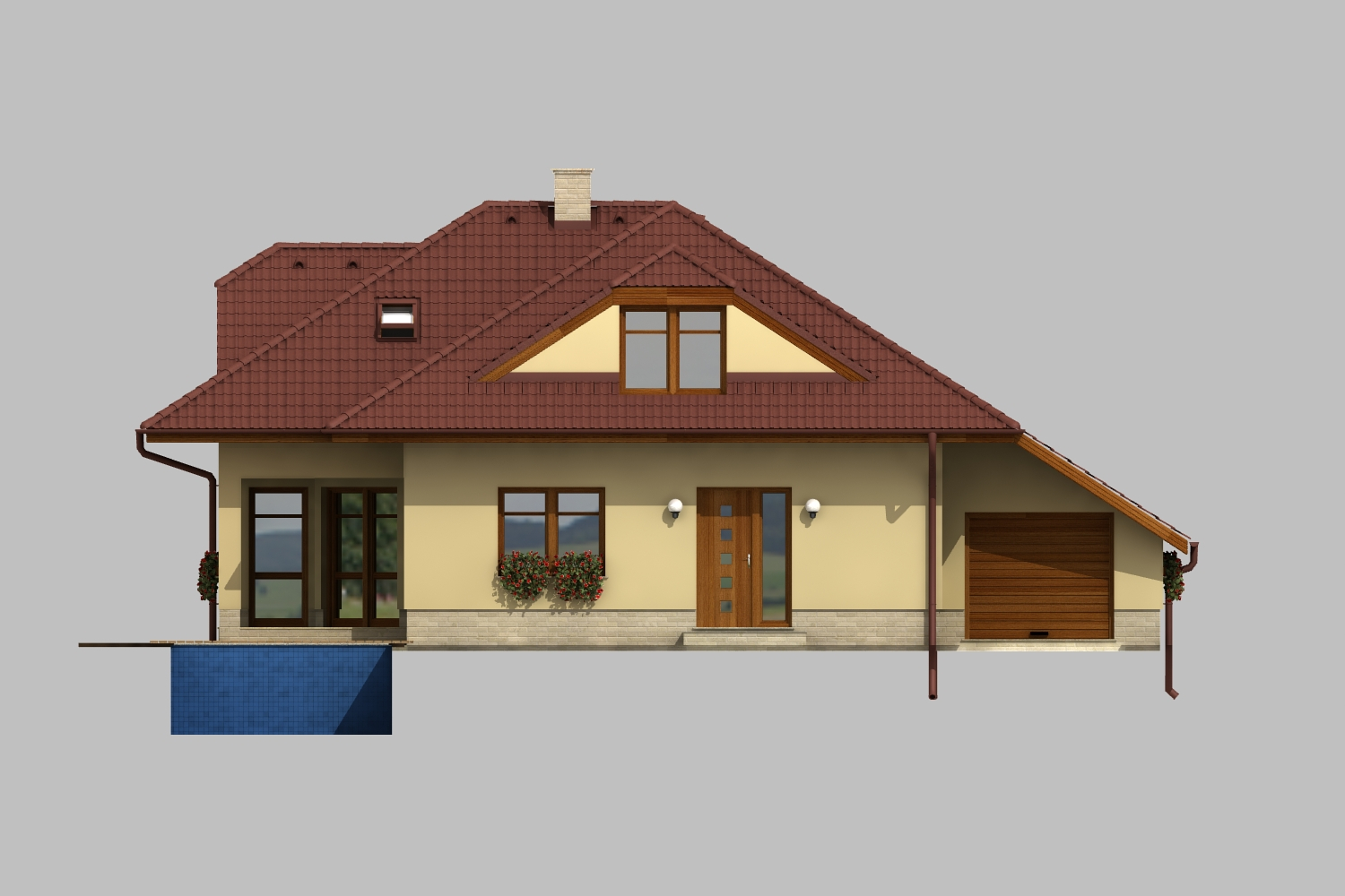 Jedna z mnoha verzí oblíbeného domu na půdorysu písmene L s valbovou střechou a krytou terasou. Nabízí pohodlné soužití tří generací – v přízemí se kromě společného obývacího prostoru nachází velká ložnice s vlastním zázemím, v podkroví jsou pokoje pro rodiče a dvě děti. Projektant pamatoval na pohodlné koupelny a dostatek úložného prostoru. K velkým výhodám domu patří integrovaná dvojgaráž, což je u domů na klíč spíše výjimkou. Za zmínku stojí i prakticky řešená kuchyň s koutem pro domácí práce.