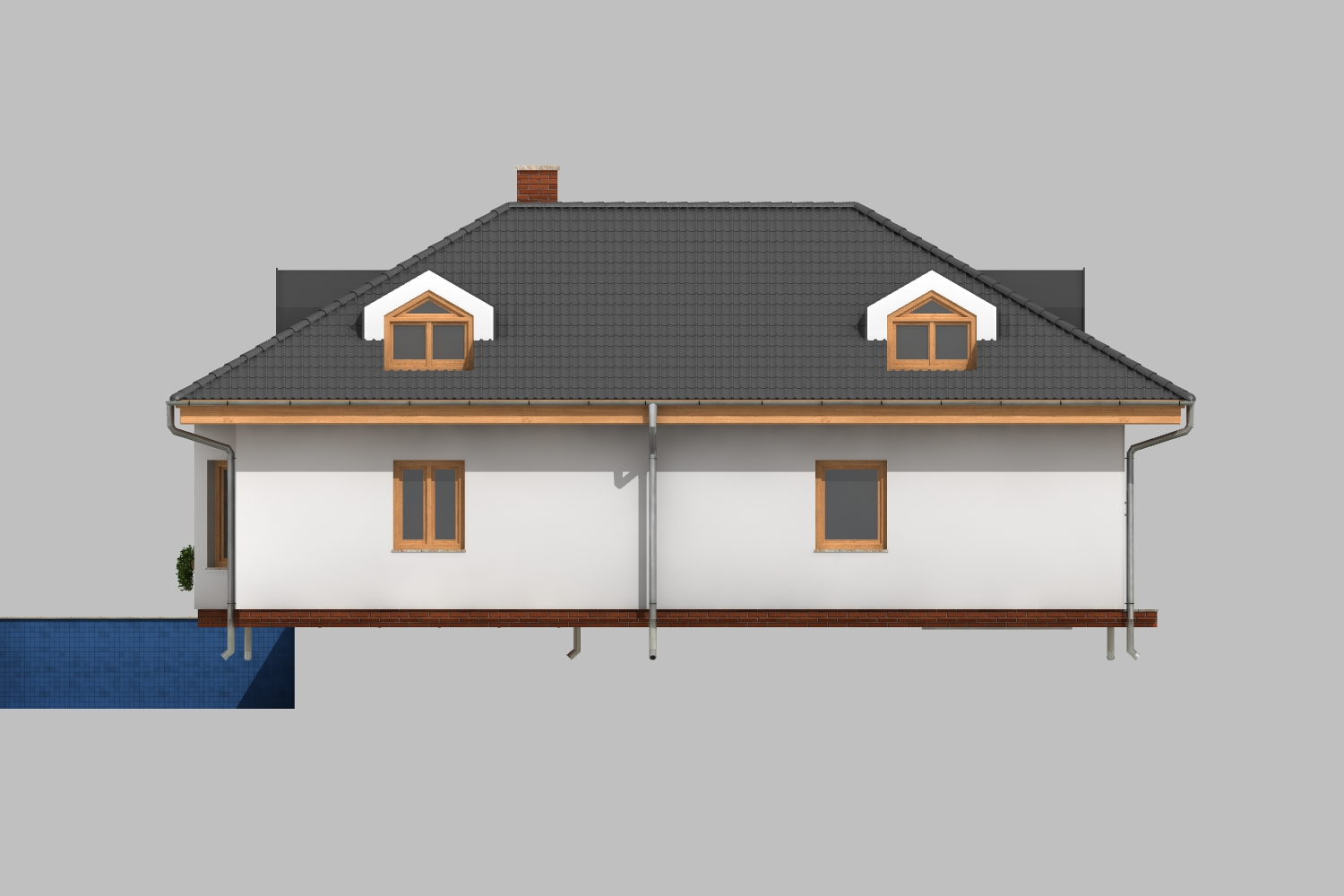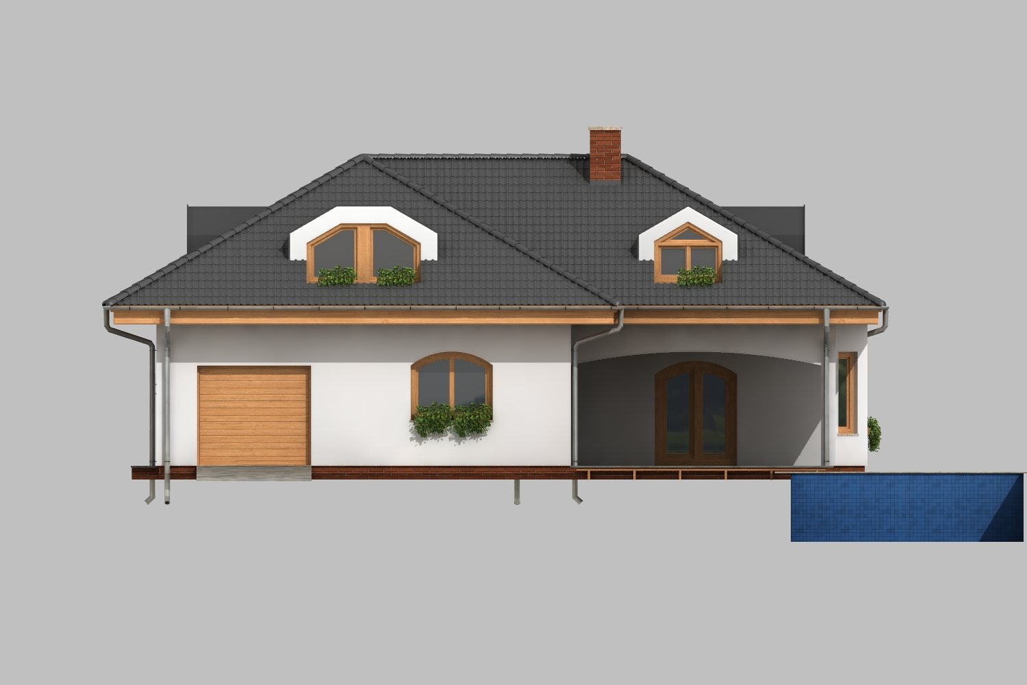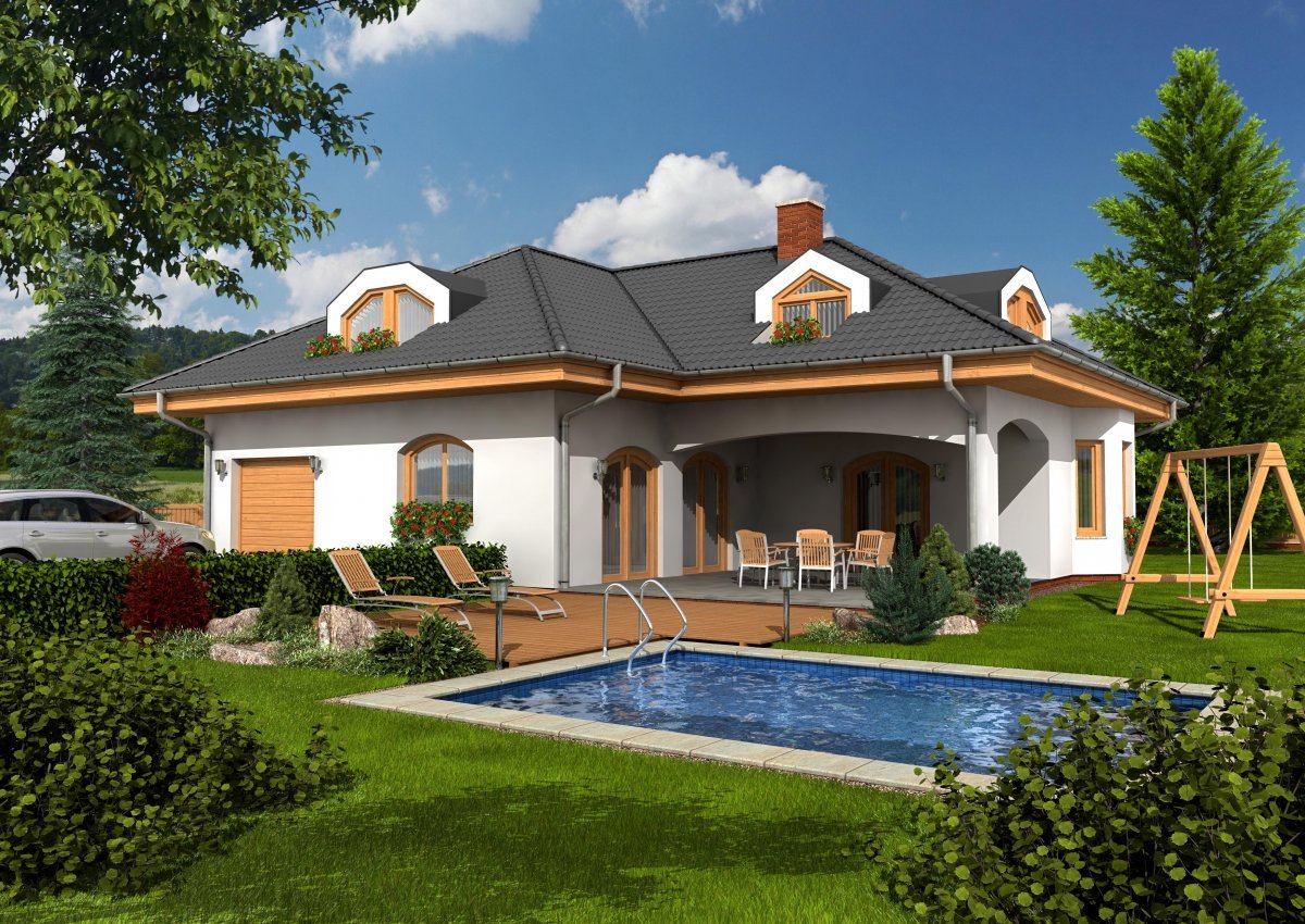 Jedna z mnoha verzí oblíbeného domu na půdorysu písmene L s valbovou střechou a krytou terasou. Nabízí pohodlné soužití tří generací – v přízemí se kromě společného obývacího prostoru nachází velká ložnice s vlastním zázemím, v podkroví jsou pokoje pro rodiče a dvě děti. Projektant pamatoval na pohodlné koupelny a dostatek úložného prostoru. K velkým výhodám domu patří integrovaná dvojgaráž, což je u domů na klíč spíše výjimkou. Za zmínku stojí i prakticky řešená kuchyň s koutem pro domácí práce.