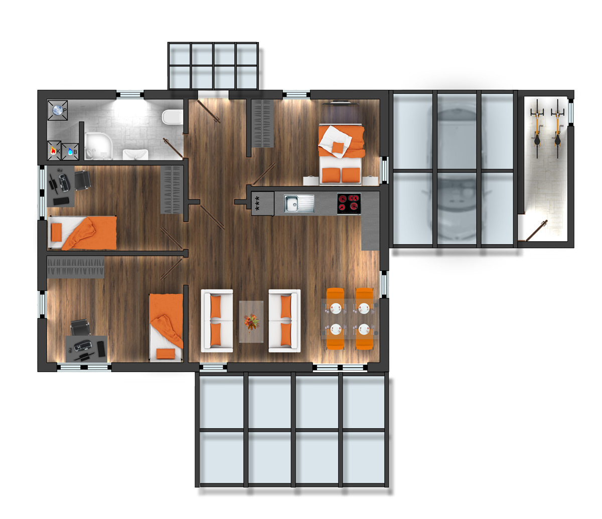 Na obývací pokoj navazuje ložnice se soukromou koupelnou. Dále v domě najdeme další koupelnu, která slouží hlavně hostům, stejně jako další pokoj. Zvláštností v domě je skrytá galerie, do které se vstupuje ze zádveří přes skříň a ukrývá úložné místo v půdním prostoru.
