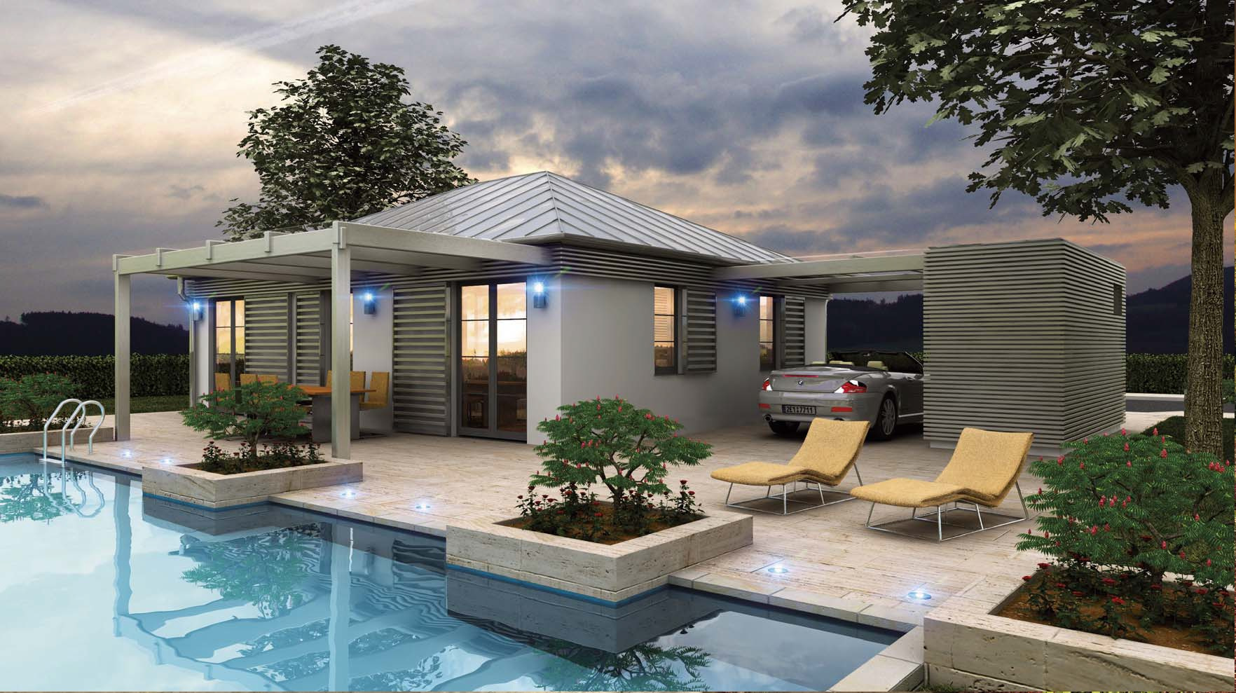 Jednoduchá moderní stavba se sedlovou střechou je nadčasová a dobře se hodí do přírody i do města. Velký obývací pokoj, přehledné uspořádání a dobře dimenzované zázemí jsou předpokladem pro pohodlné bydlení. I u domu podélného tvaru se podařilo vytvořit chráněnou rohovou terasu.
