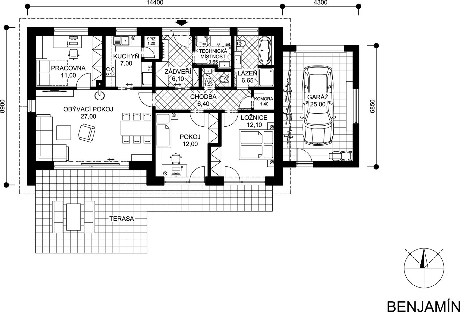 Benjamín je komfortní bezbariérový přízemní rodinný dům se sedlovou střechou o sklonu 30°. Součástí domu může být přistavěná garáž zastřešená plochou střechou.