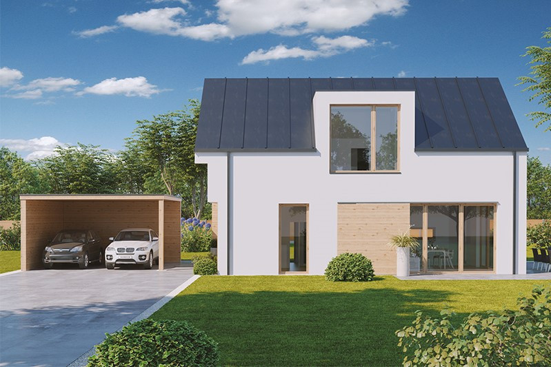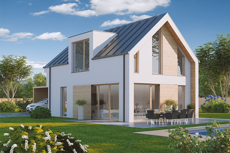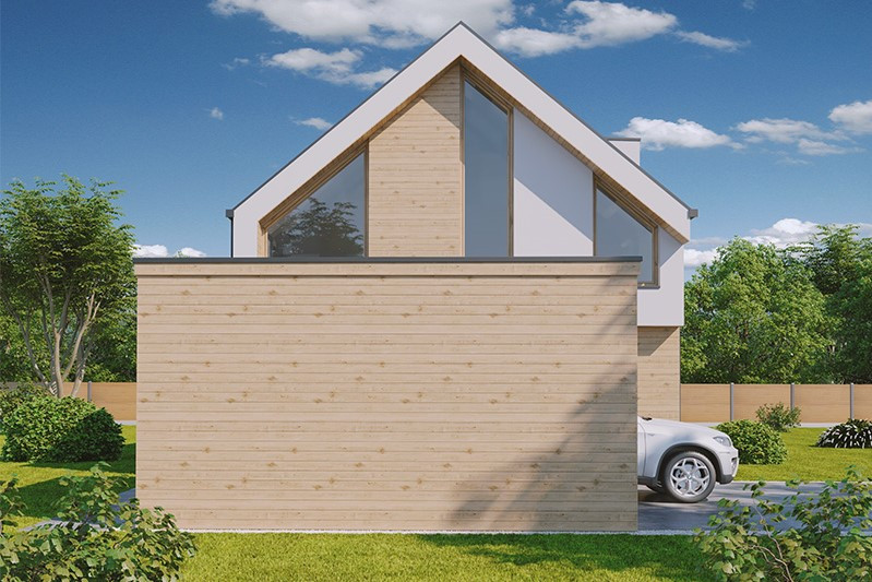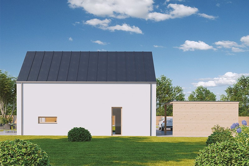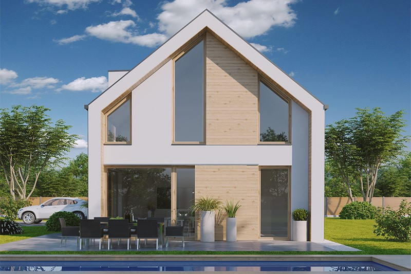 Dům dobře zapadne do města i na venkov a uspokojí nároky na moderní bydlení pro čtyřčlennou rodinu. Velký společný obývací prostor v přízemí je promyšleně rozdělen na kuchyňskou část a sezení, ke kladům patří také chráněná rohová terasa, pohodlné zázemí a dostatek úložného prostoru.