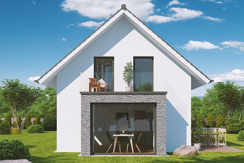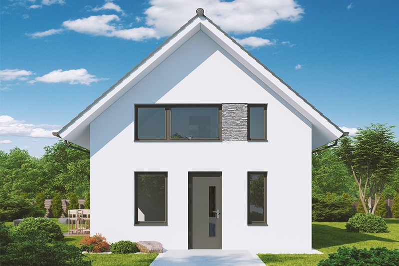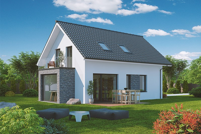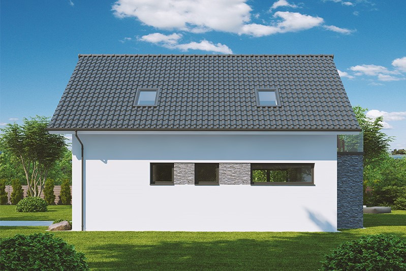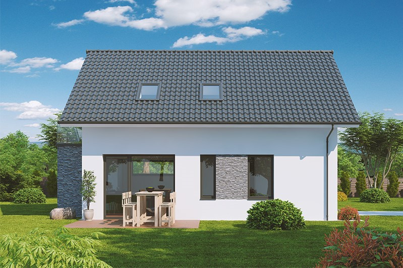 Jednoduchý úsporný dům má tradiční tvar, ale moderní design. Hodí se pro až pětičlennou rodinu, do městské i venkovské zástavby. Atrakt... ivním prvkem je předsazená jídelna s prosklenou stěnou.