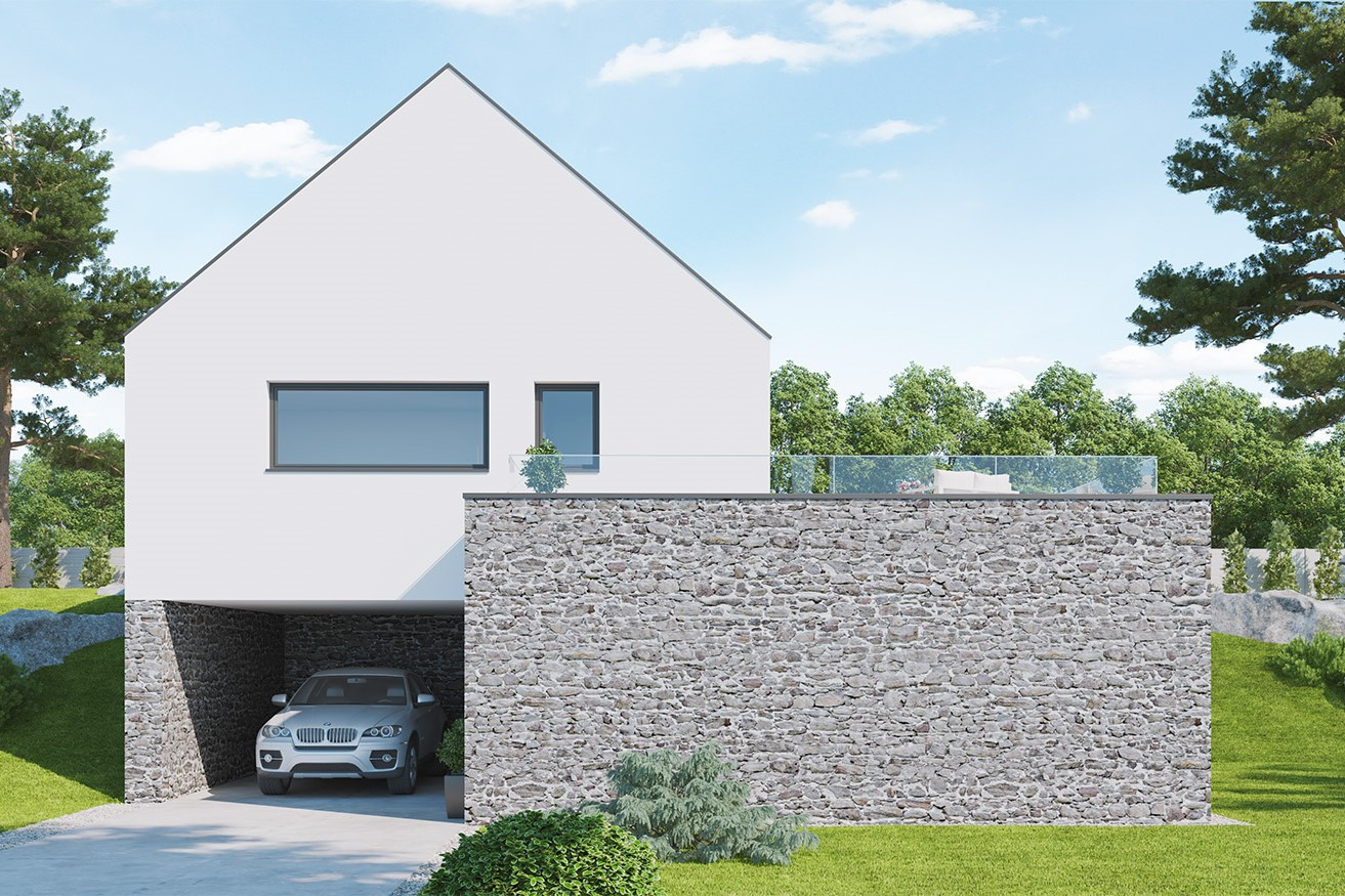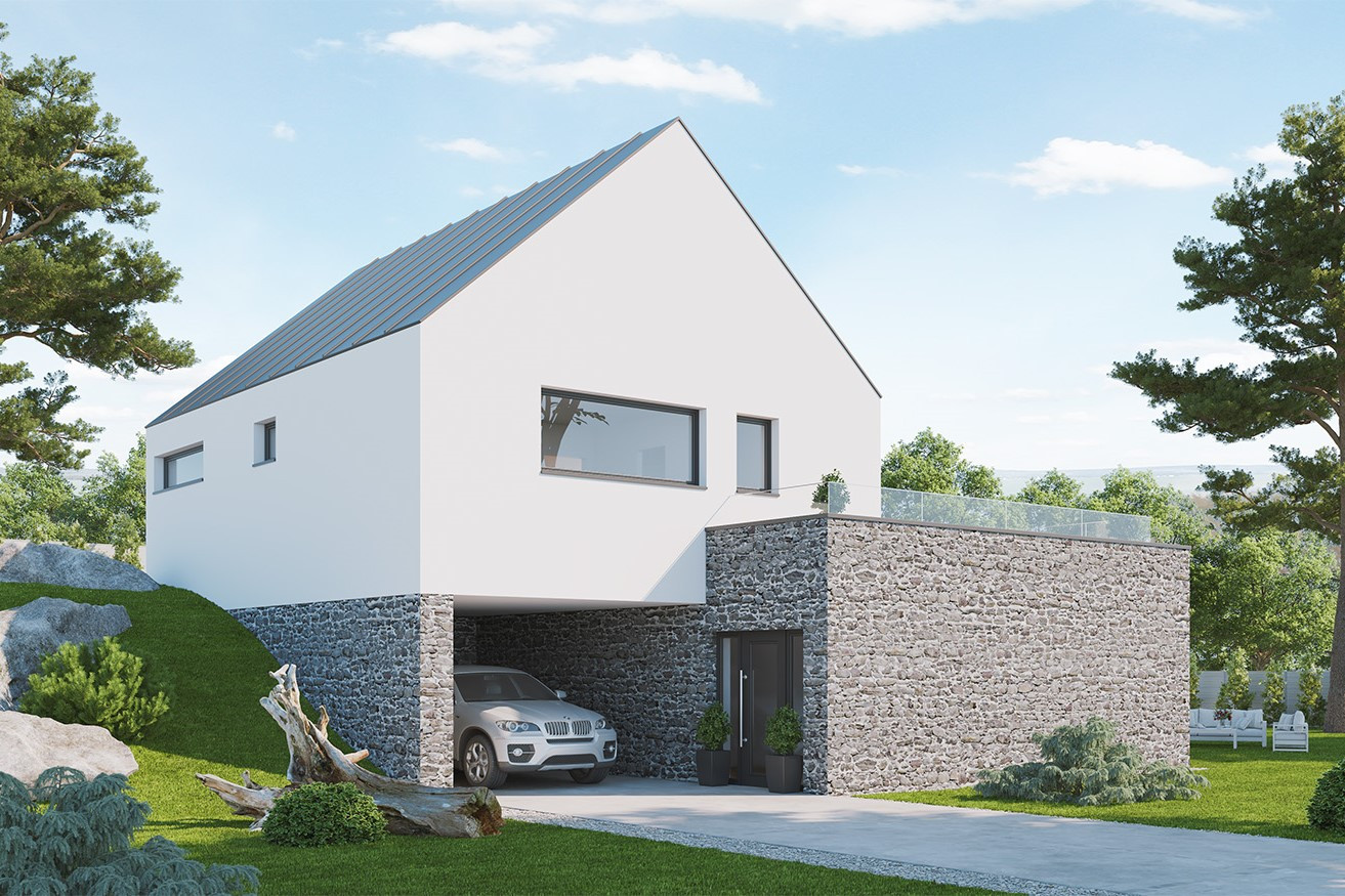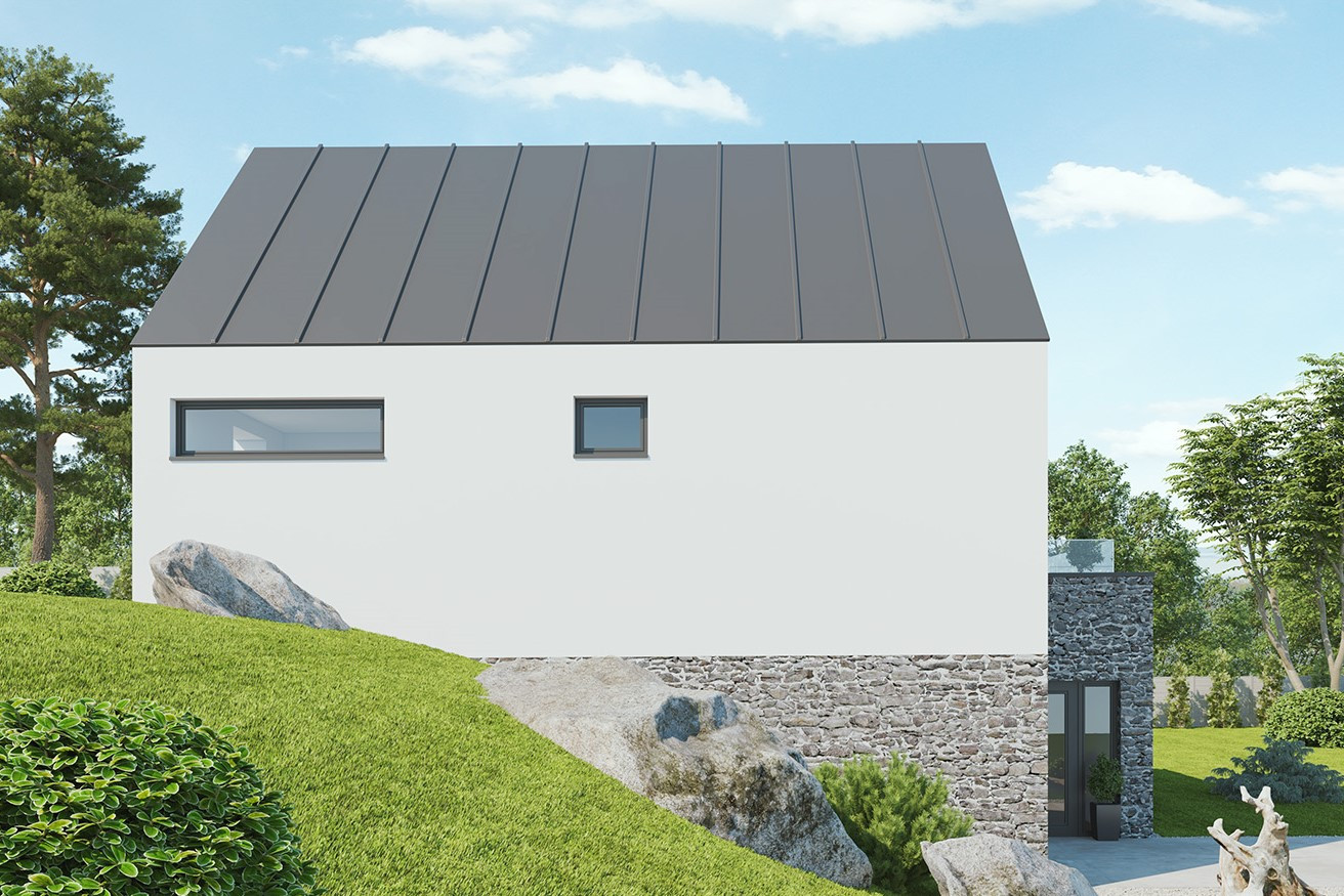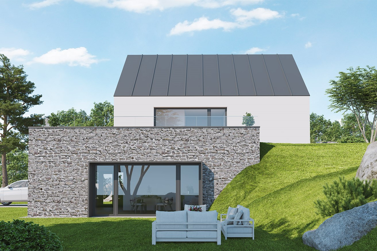 Dům dobře zapadne do města i na venkov a uspokojí nároky na moderní bydlení pro čtyřčlennou rodinu. Velký společný obývací prostor v přízemí je promyšleně rozdělen na kuchyňskou část a sezení, ke kladům patří také chráněná rohová terasa, pohodlné zázemí a dostatek úložného prostoru.
