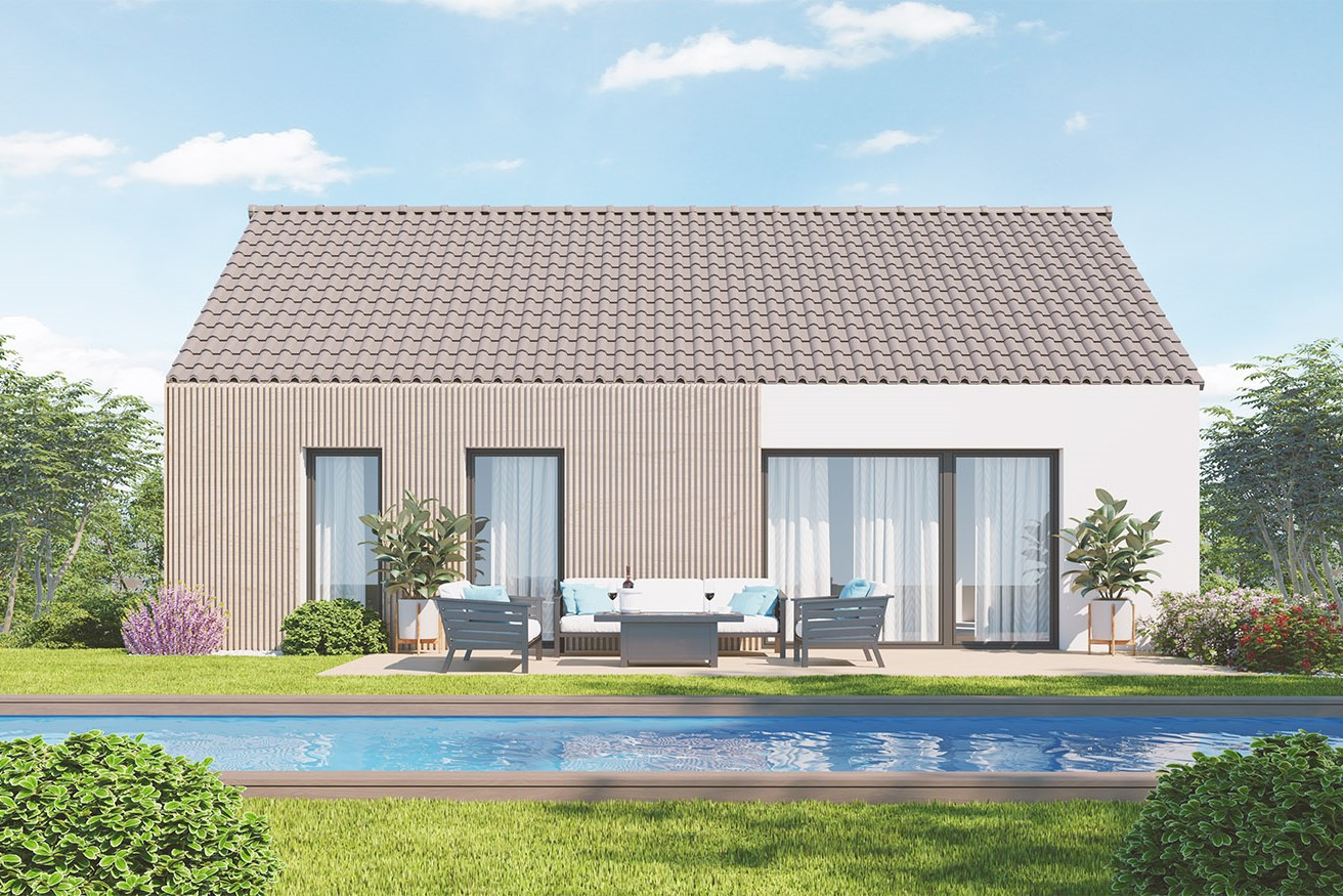Dům dobře zapadne do města i na venkov a uspokojí nároky na moderní bydlení pro čtyřčlennou rodinu. Velký společný obývací prostor v přízemí je promyšleně rozdělen na kuchyňskou část a sezení, ke kladům patří také chráněná rohová terasa, pohodlné zázemí a dostatek úložného prostoru.