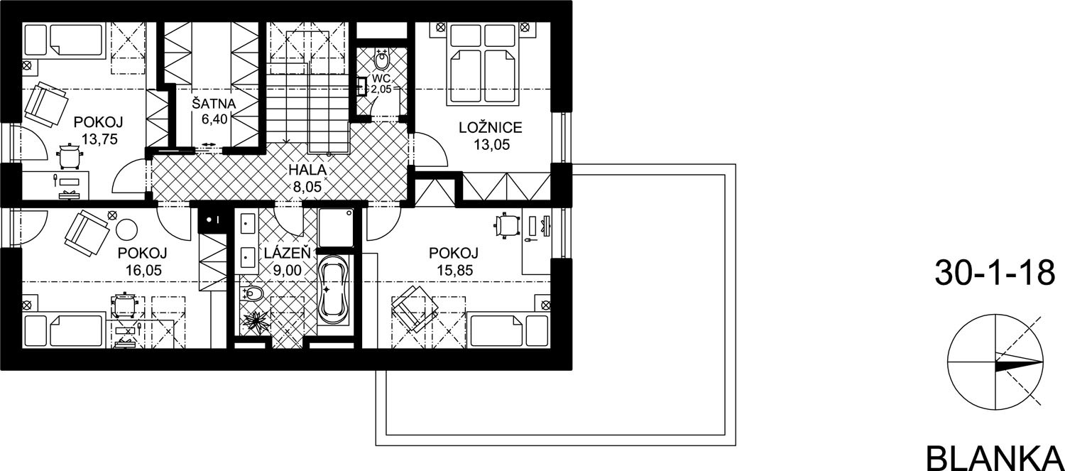 pohodlné zázemí (dvě koupelny, dvě samostatná WC, šatna, tech. místnost)