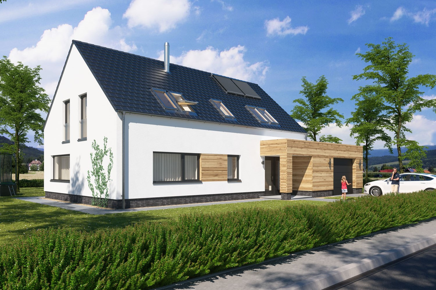 Dům dobře zapadne do města i na venkov a uspokojí nároky na moderní bydlení pro čtyřčlennou rodinu. Velký společný obývací prostor v přízemí je promyšleně rozdělen na kuchyňskou část a sezení, ke kladům patří také chráněná rohová terasa, pohodlné zázemí a dostatek úložného prostoru.