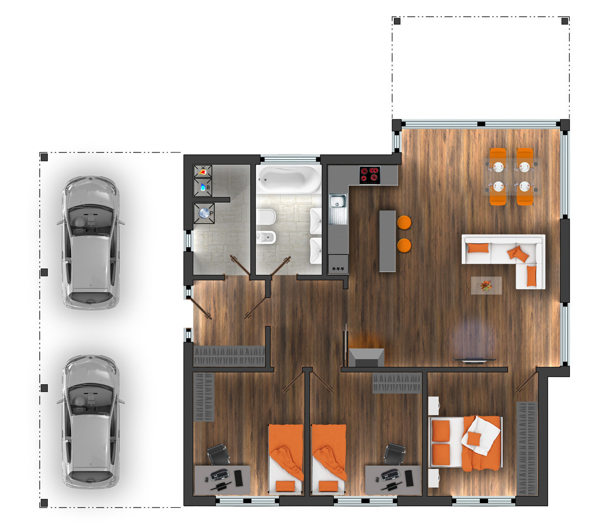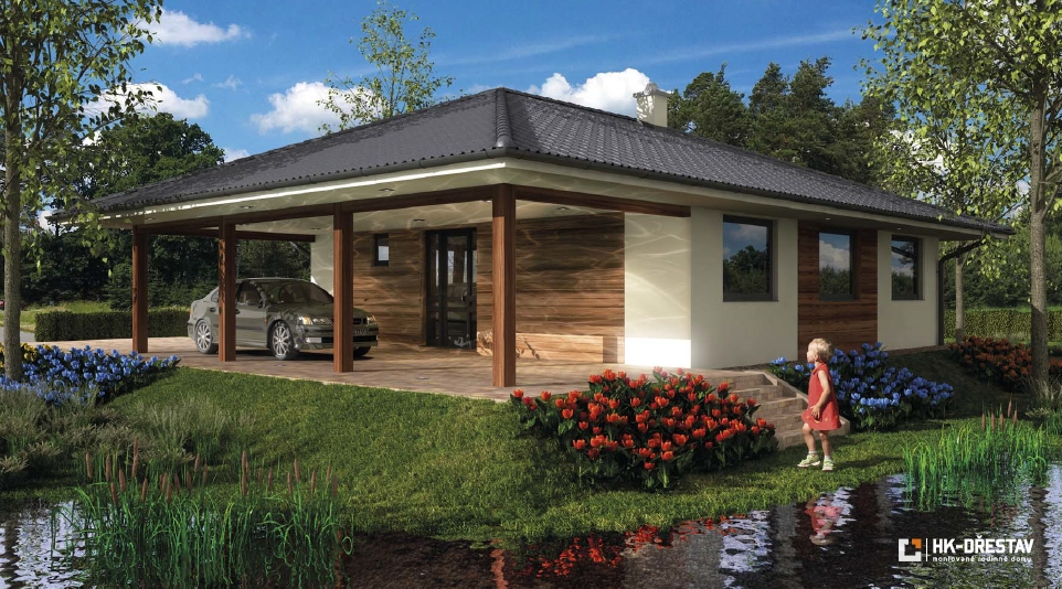 Jednoduchý moderní dům bude dobře vypadat v nové i starší zástavbě. Vyžaduje delší obdélníkový nebo velký čtvercový pozemek. Poskytne pohodlné bezbariérové rodinné bydlení, má velký společný obývací prostor, průchozí do ložnicové části. Z každého pokoje se dá vyjít přímo na zahradu. Výhodou je i úsporný provoz.