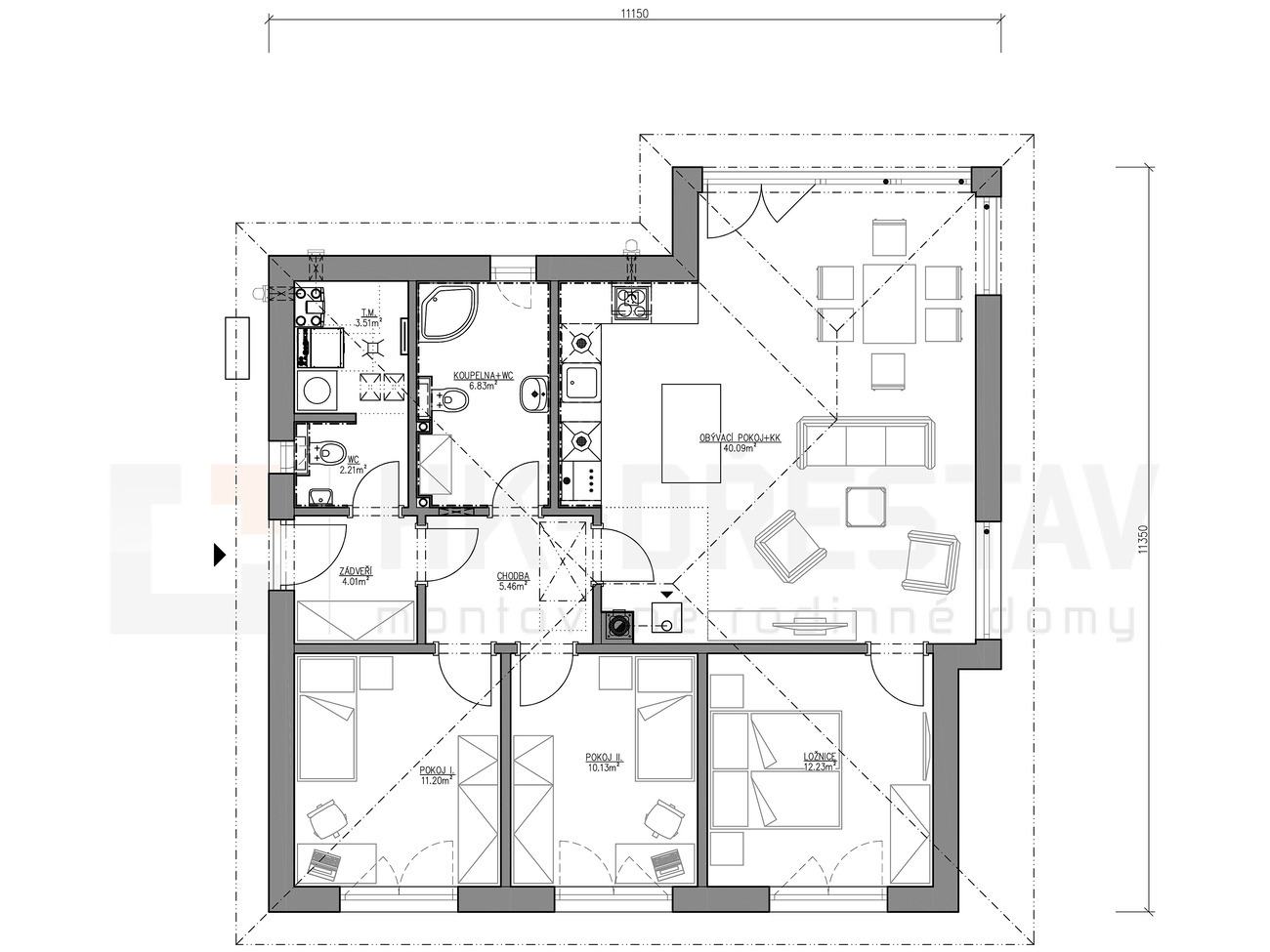 Jednoduchý bezbariérový dům poskytne praktické bydlení za výhodnou cenu a s nízkými provozními náklady. Hodí se do městské i venkovské zástavby, má příjemnou krytou terasu a francouzská okno z pokojů přímo na zahradu. Určitou daní za úspornost je malá koupelna bez vany, navíc spojená s tech. místností.