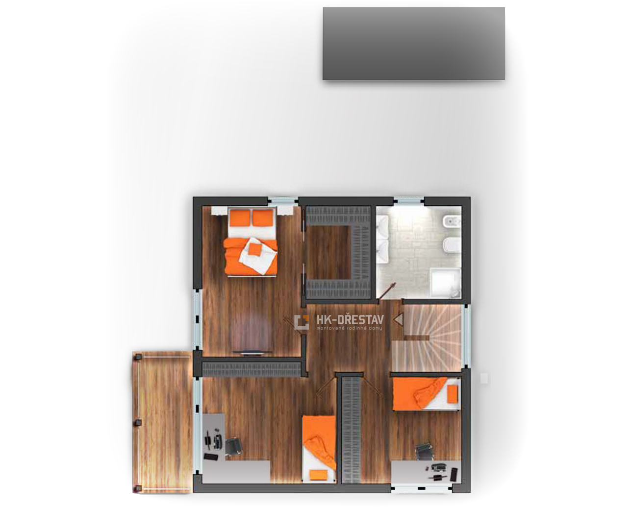 Přízemí domu je krásně propojeno se zahradou velkými francouzskými okny. K domu si můžete dodělat pergolu a využít průchod z obývacího pokoje například na vychutnání ranní kávy. Pokoj v přízemí poslouží jako pracovna, pokoj pro hosty, pokoj pro prarodiče nebo jako odpočinková místnost, vše podle potřeby. Nechybí zde koupelna se sprchou. V podkroví domu se nachází čtyři velké pokoje a koupelna s vanou.